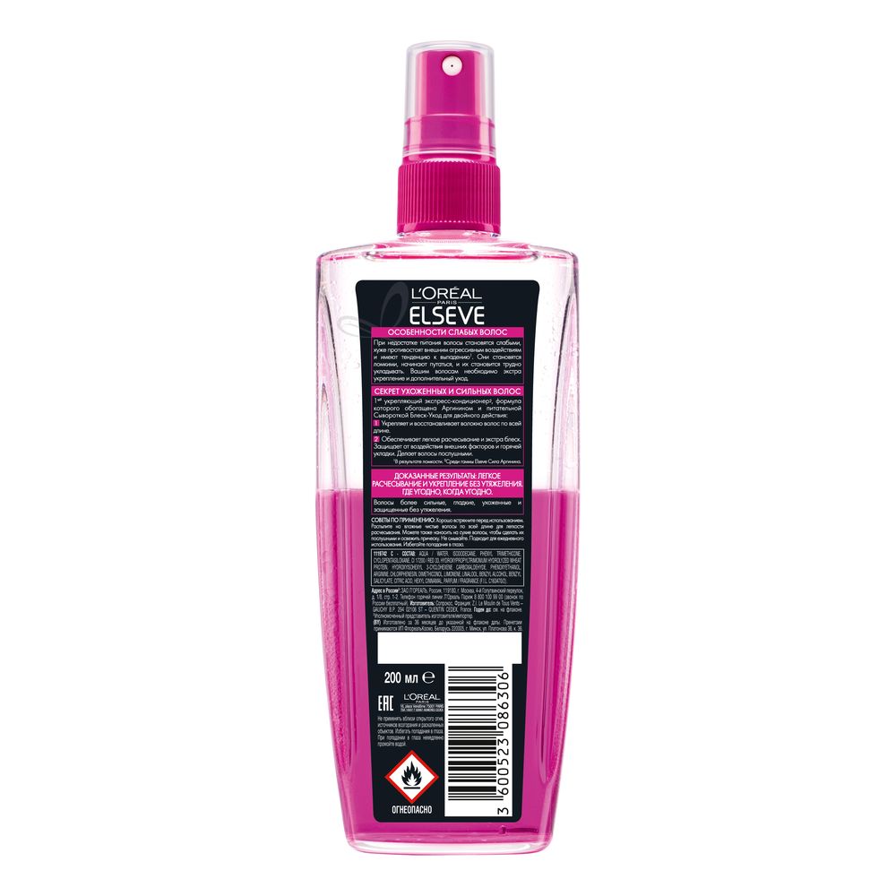 Формула спрея - кондиционера для волос серии "Эльсев, Сила Аргинина" содержит уникальный компонент – Аргинин, который усиливает структуру волос, и специальную сыворотку, действие которой имеет двойной эффект:
