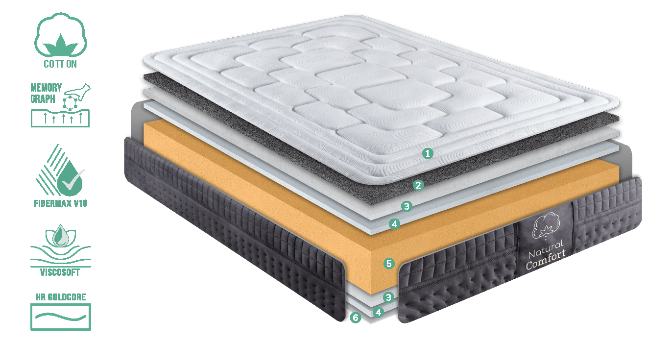 Система экстра-релакса 5 см (VISCOGRAFENO-GEL холода).Система Экстра релакса состоит из современных материалов, чтобы улучшить чувство адаптируемости. Состоит из вискографена с холодным гелем, волоконFIBERMAX V10 и SoftFoam. Интегральная вязкографеновая железа с холодным гелем, высокой плотности. Графен и гель обеспечивают эргономичные, гигиенические, антистрессовые и терморегулируемые свойства. Гипоаллергенные волокна обеспечивают высокую степень комфорта и обеспечивают матрас большей воздухопроницаемостью; А мягкая пена позволяет обивке иметь большую мягкость и обеспечить более адаптирующийся отдых.