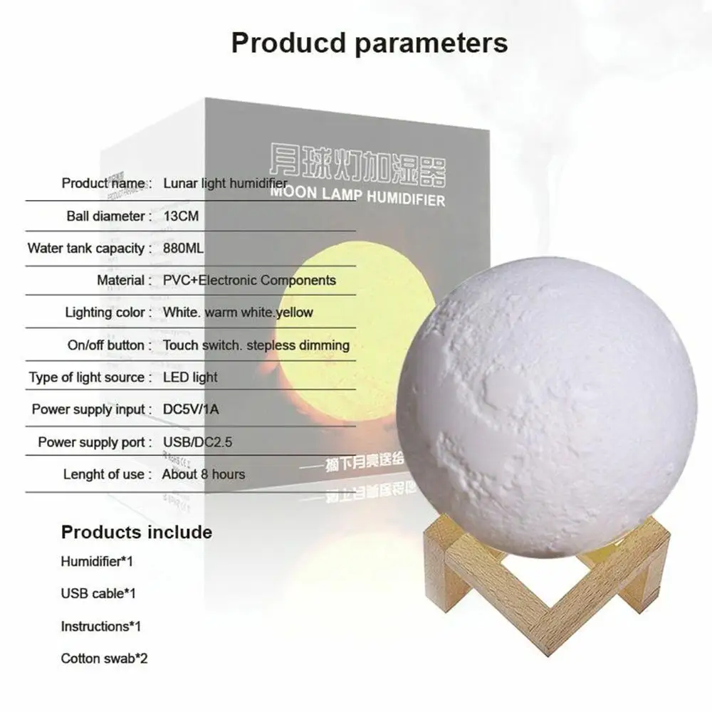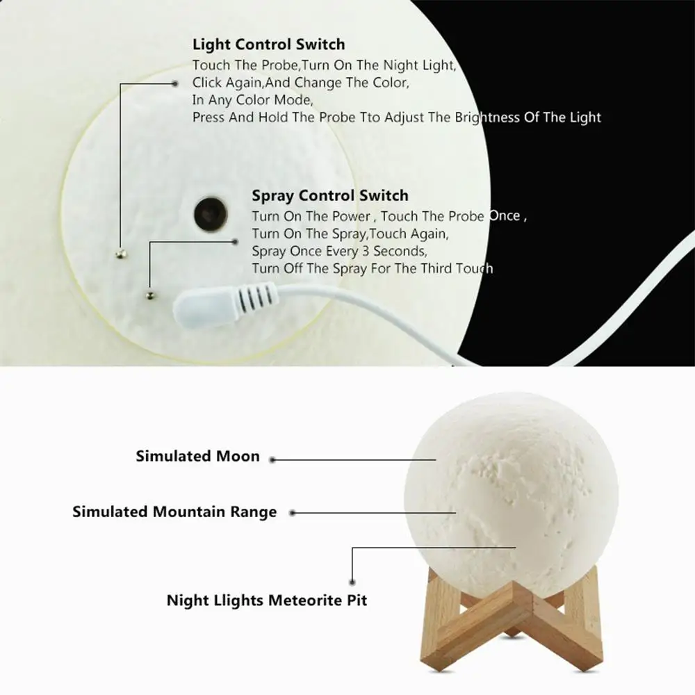-Этот увлажнитель добавляет технологии распыления к технологии лунной лампы для поддержки функции увлажнения во время работы в качестве ночной лампы.