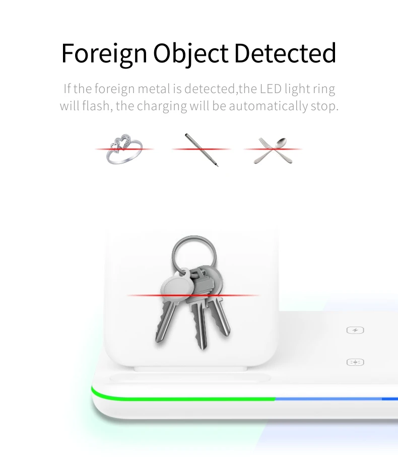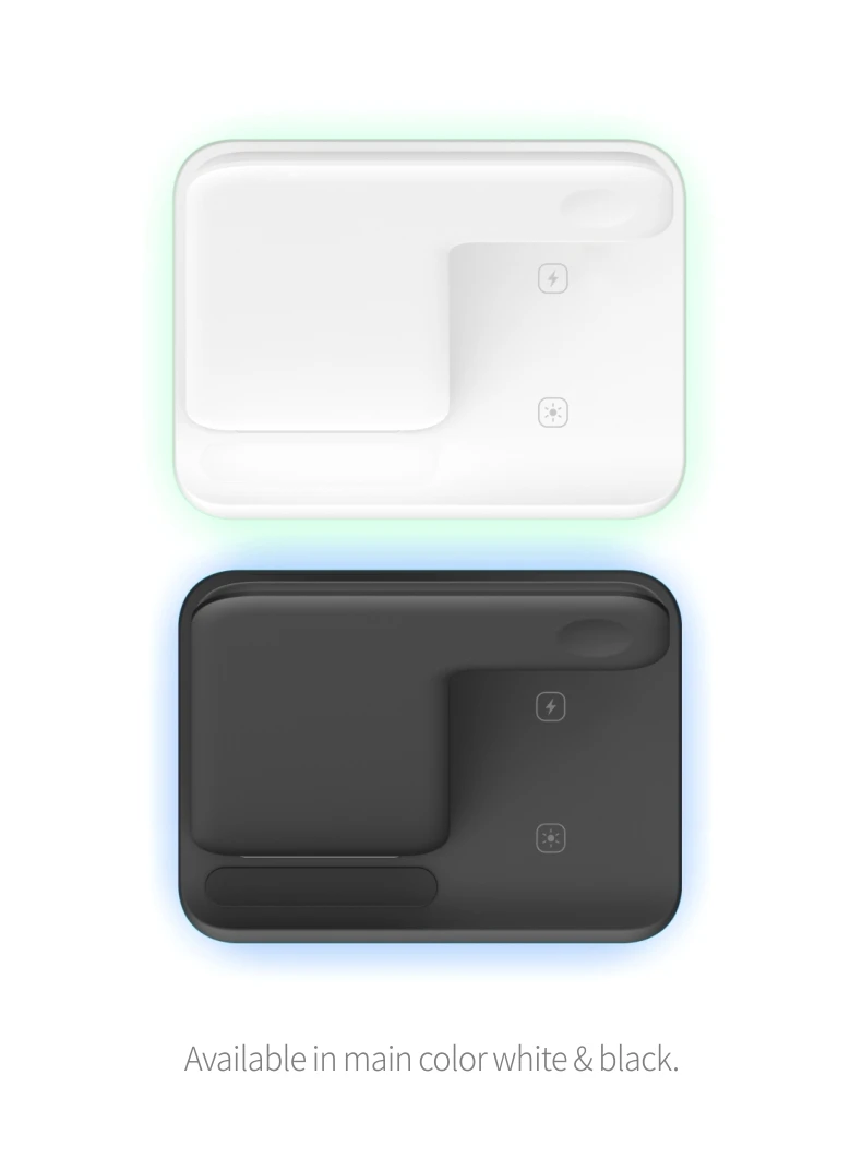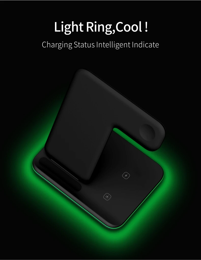 Защита от перегрузки по току/перегрева, специальная Сертификация внешнего вида, сертификация CE/FCC/ROHS, одновременная зарядка часов/мобильных телефонов/наушников, вертикальная подставка.
