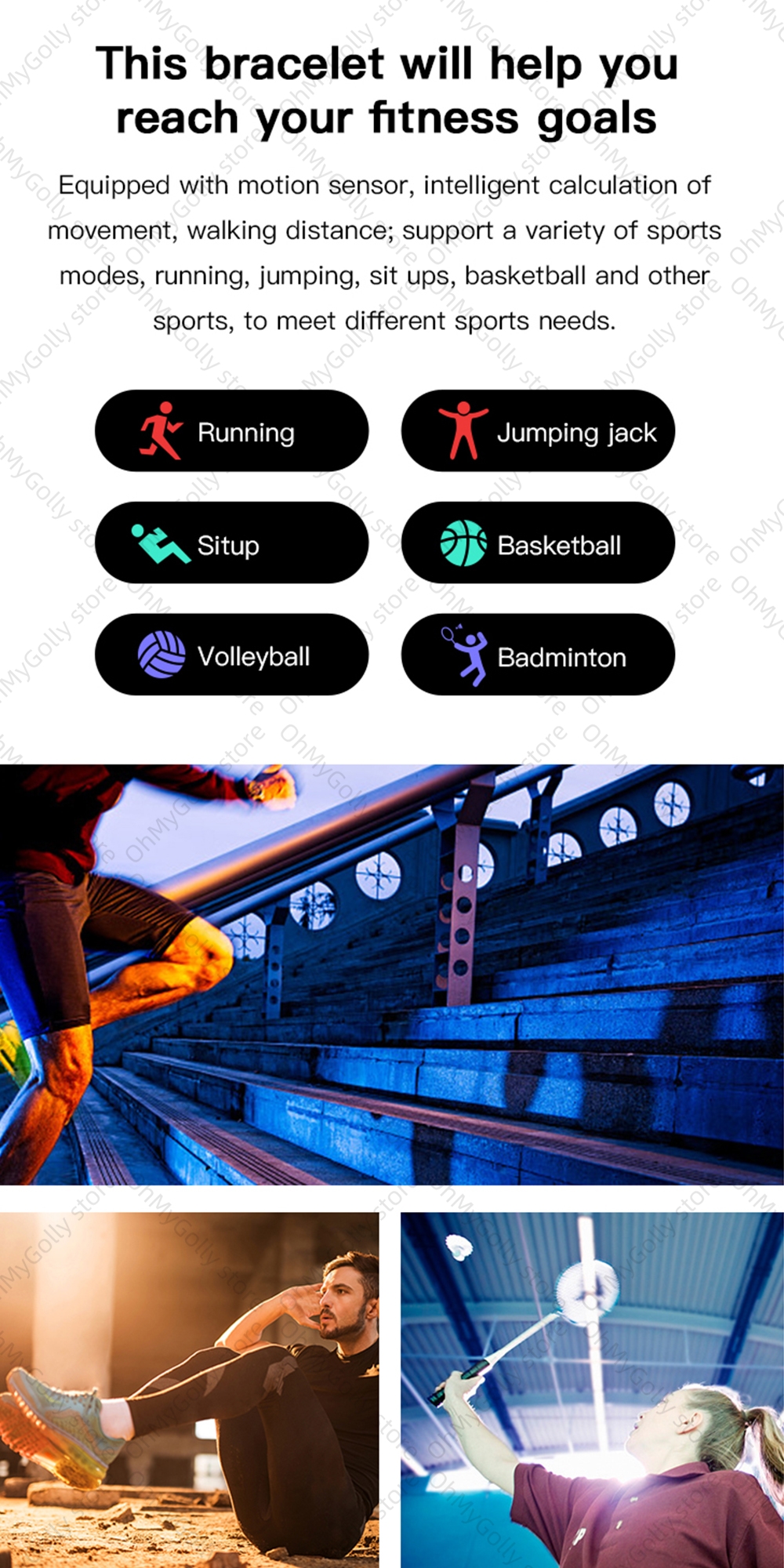 Подсчет шагов, время упражнений, режим упражнений (сидения, бег, езда на велосипеде, бадминтон, настольный теннис, теннис, скакалка, Баскетбол), пробег упражнений, потребление калорий
