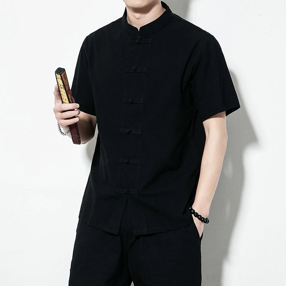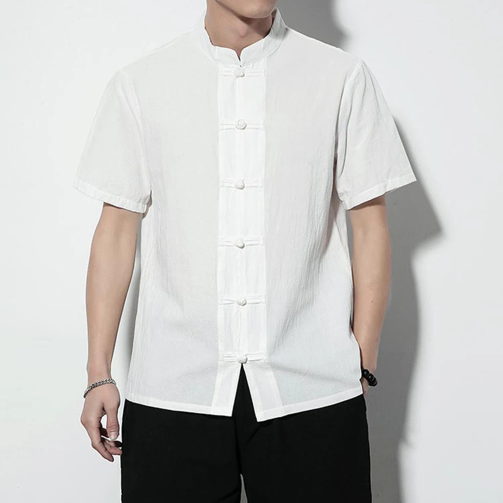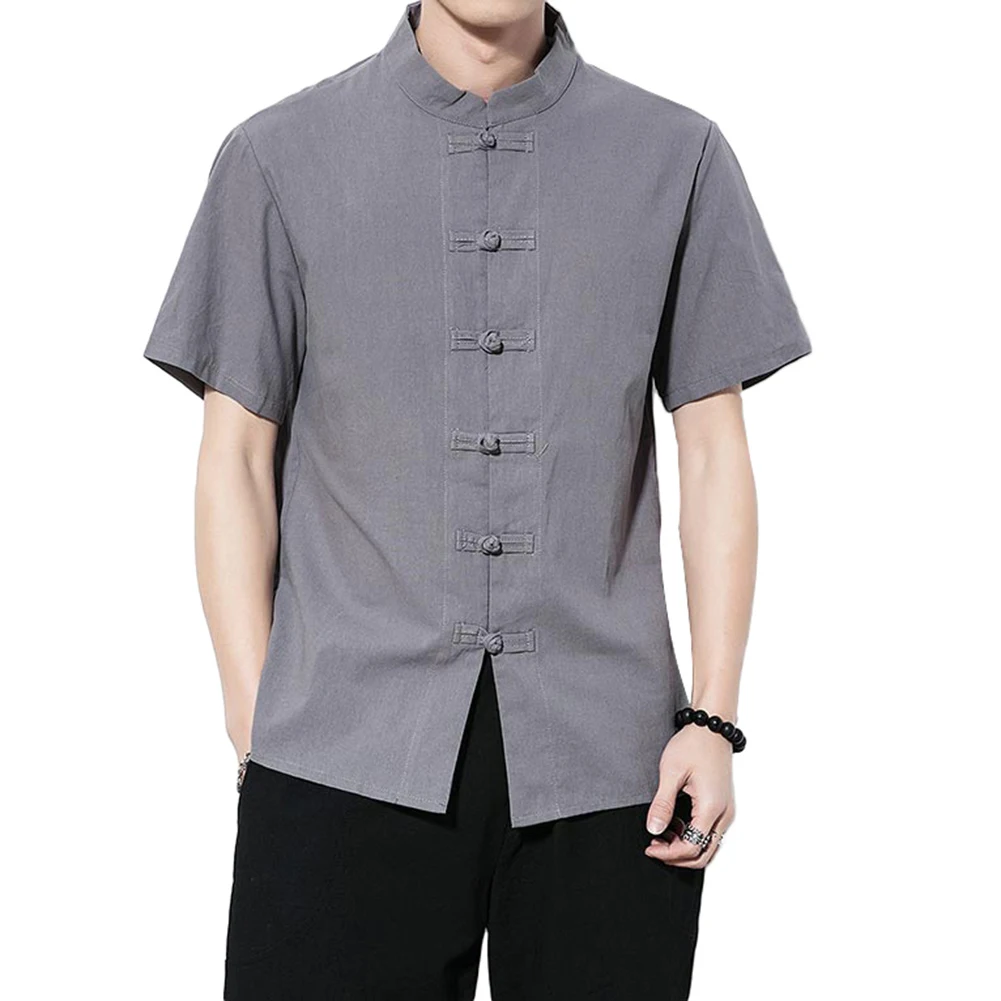 Мужская однотонная Свободная рубашка с воротником-стойкой и коротким рукавом в китайском стиле