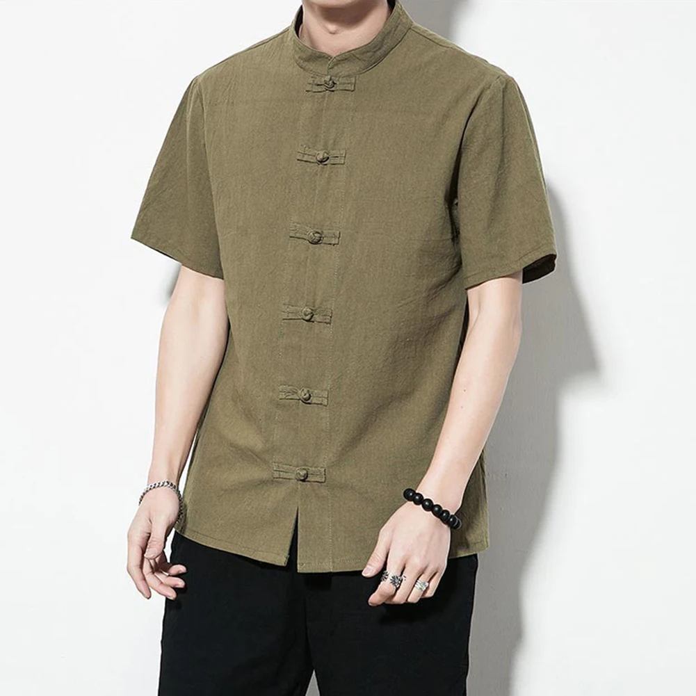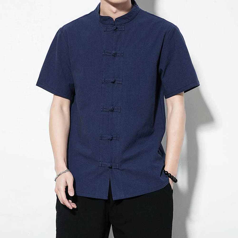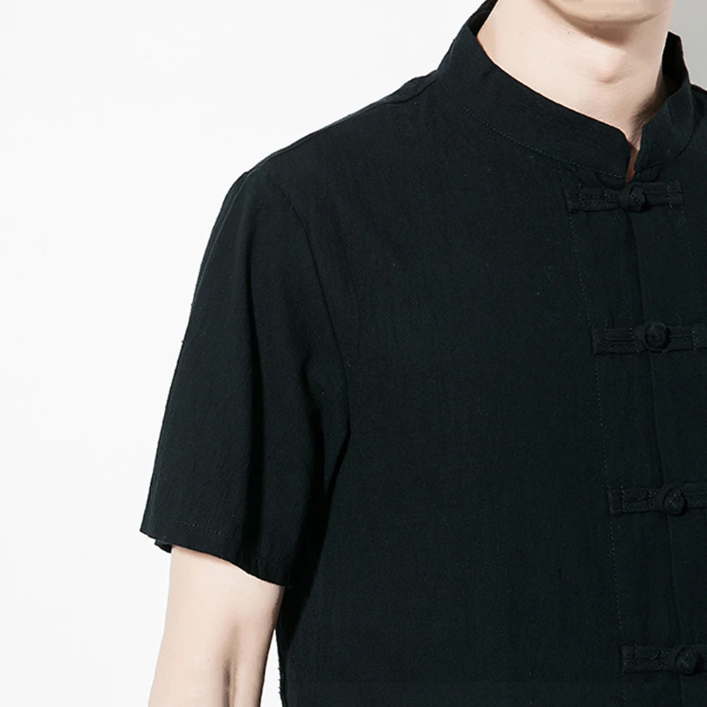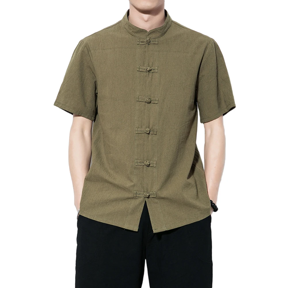 Мужская однотонная Свободная рубашка с воротником-стойкой и коротким рукавом в китайском стиле