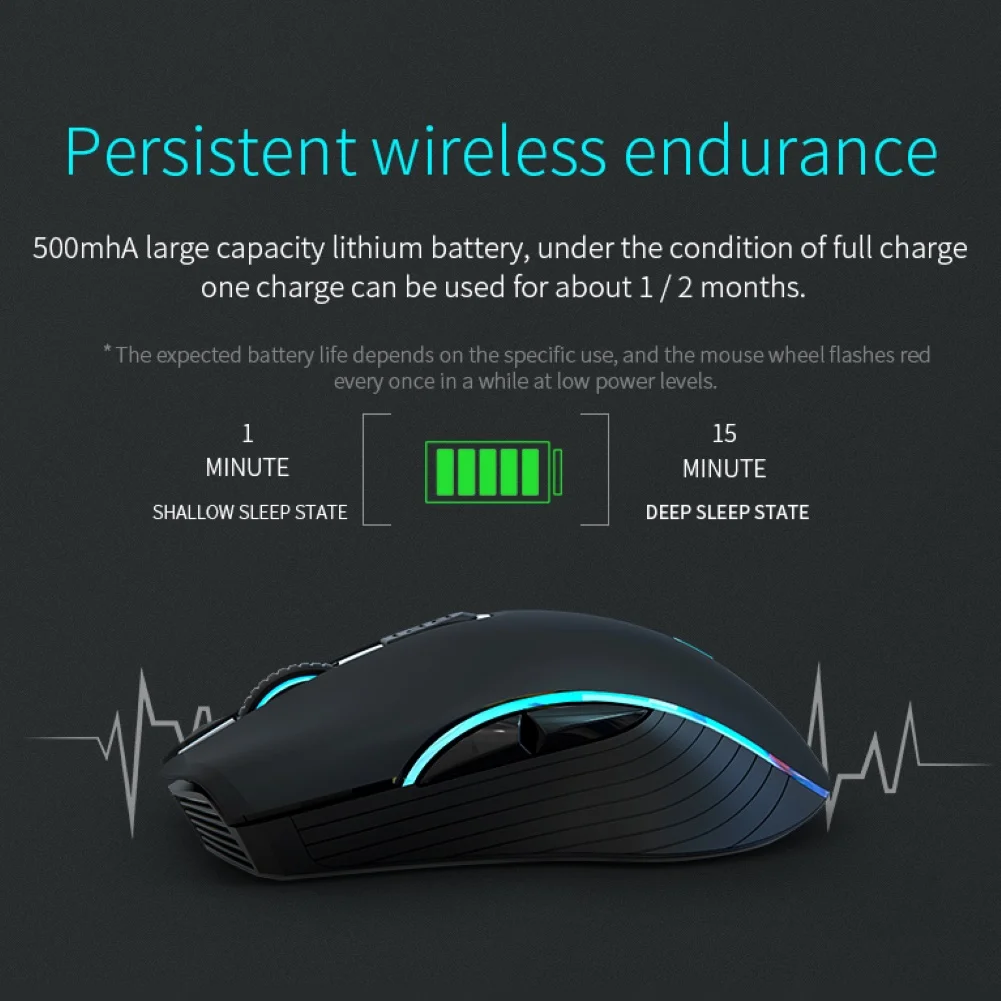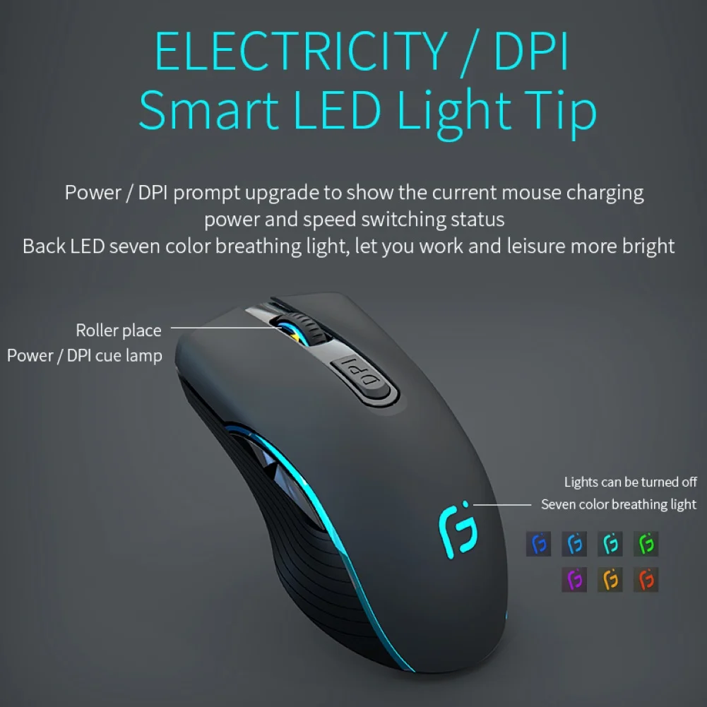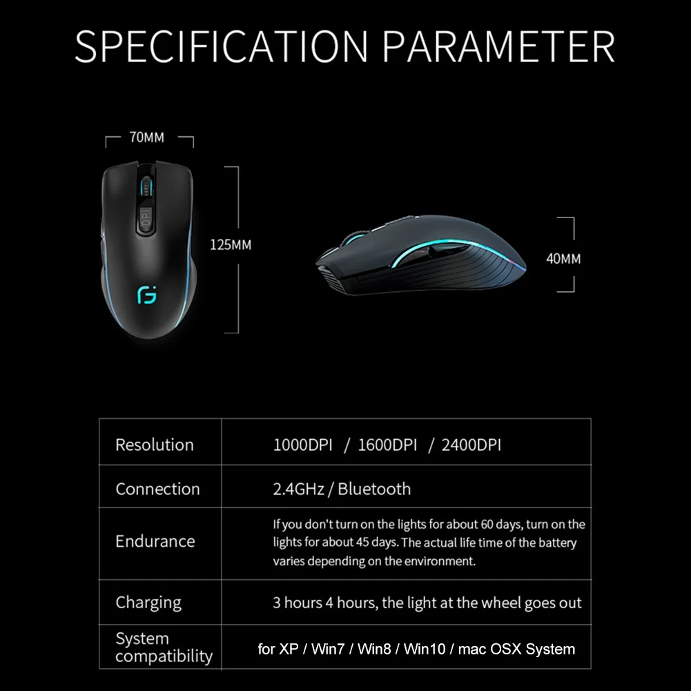 Характеристики: Встроенный перезаряжаемый аккумулятор, прост в использовании. Эргономичный дизайн, стильный внешний вид и комфортные ощущения. Профессиональная оптическая технология позиционирования для более точного позиционирования. Умный мини-приемник, одно-к-одному подключение, сколько компьютеров используют вместе без искаженного и серийного кода. До 16 миллионов видов дизайна идентификационного кодирования, улучшают характеристики защиты от помех мыши. Произвольные 360 углы окружающего использования, с контрольным расстоянием более 10 метров. Уникальный интеллектуальный дизайн управления схемой, делает мышь умнее и экономит энергию. Разрешение 1000-1600-2400dpi Регулируемая частота, наслаждайтесь беспроводным свободным пространством. Системные требования: для Windows 200/XP/Vista/7/8, для Linux и для MAC операционной системы. Название товара: Беспроводная мышь Материал: АБС-пластик Расстояние беспроводной передачи: ≥ 10 м Беспроводная Частота: 2402 МГц-2480 МГц Беспроводные рабочие каналы: 16 Номинальный рабочий ток: 8-15mA@1.5V/3В Прочность кнопки: 50-60 ± 10 г Срок службы ключа: 3 миллиона раз Время зарядки: 500 Аккумулятор: встроенный аккумулятор (входит в комплект) Функция: беспроводной, перезаряжаемый, эргономичный, цветной светодиодный Размеры: 12,5 см x 7 см x 4,2 см/4,92 "x 2,76" x 1,65 "(прибл.) Примечания: Благодаря светильник и экрана Цвет Товара может быть s светильник ly отличается из-за характеристик монитора компьютера. Возможны незначительные отклонения в размерах из-за различных измерений вручную. Посылка включает в себя: 1 x беспроводная мышь 1 x Приемник 1 x зарядный кабельСмотрите так же другие товары: