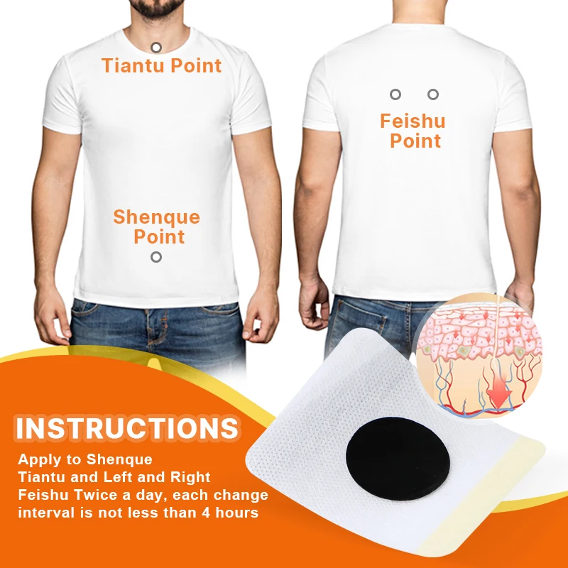 При использовании сначала протрите пораженную область, откройте посылка, чтобы удалить обратную сторону бумаги, а затем Прикрепите это изделие к шее точки Dazhui, точки Tiantuo, точки Feiyu, точки Tanzhong и другие части акупунктурных точек, с одним патчем в точку.
