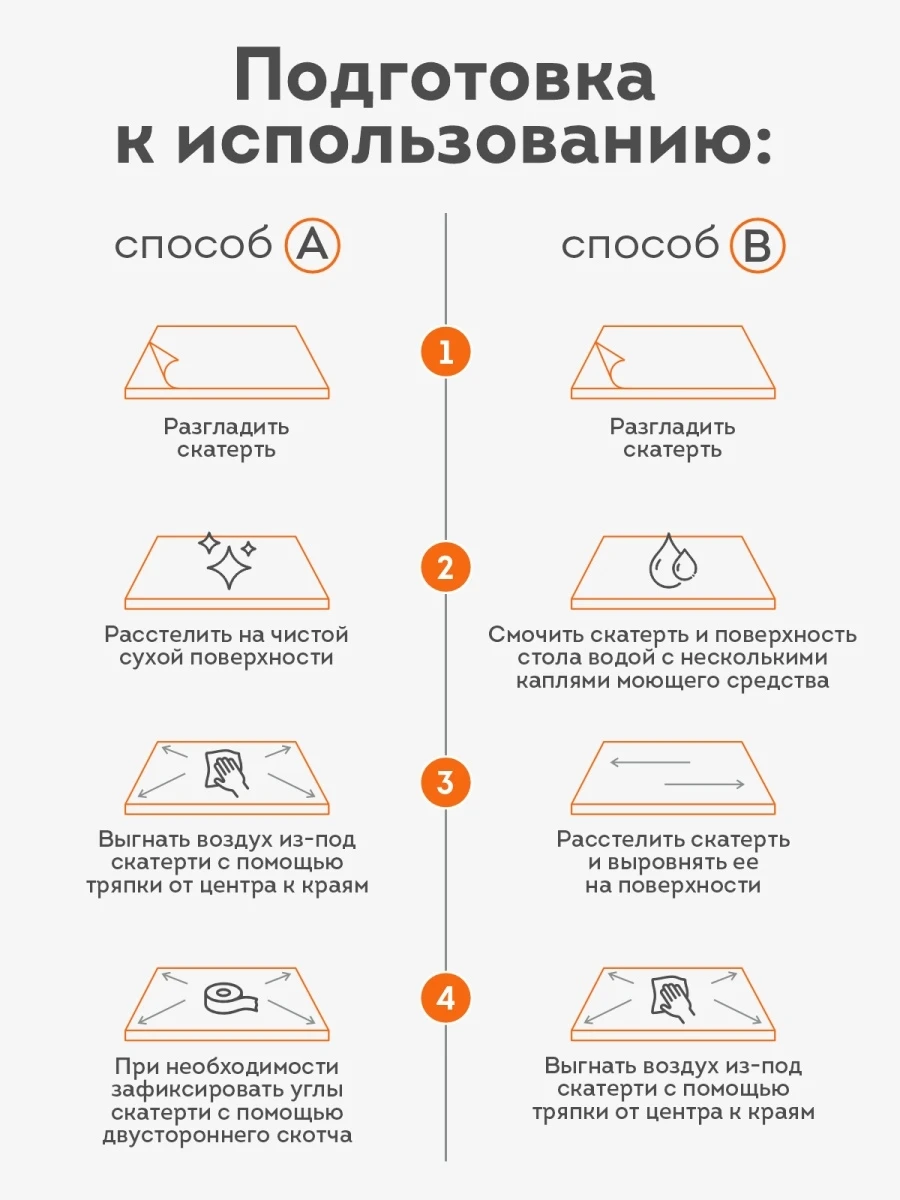 ВАЖНО! Для стеклянных, мраморных, глянцевых пластиковых, а так же лакированных поверхностей для предотвращения образования эффекта "масляных следов" (видимого слипания), мы рекомендуем стелить глянцевую силиконовую скатерть через распыление мыльного раствора, подробнее в прилагаемой инструкции к товару.