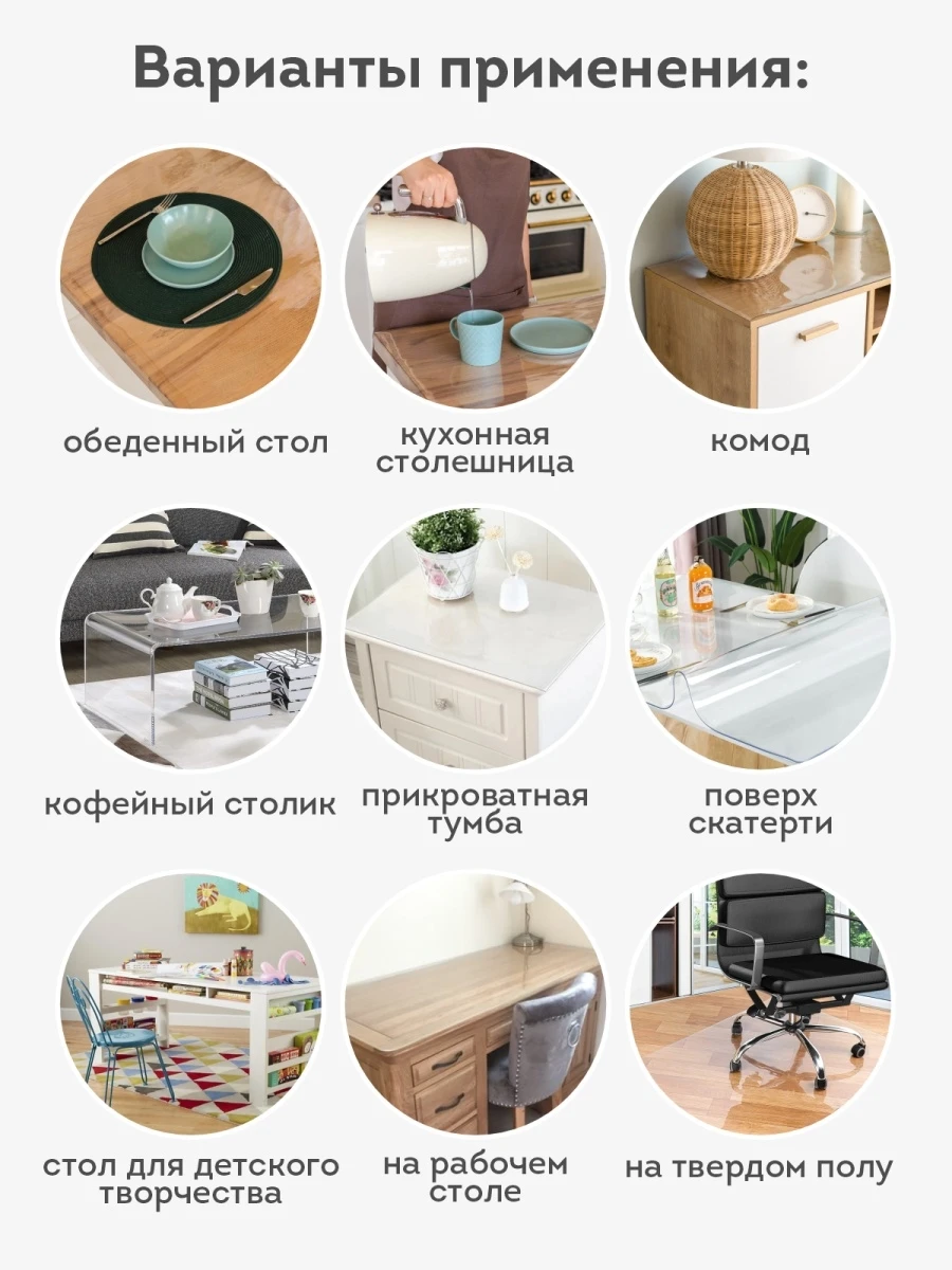 Не менее удобно применение гибкого стекла в детской комнате, рабочем кабинете или спальне. Идеально защищает кухонный, офисный, рабочий, школьный и другие столы.Гибкое стекло - это высококачественная замена обычным клеенкам, скатертям, салфеткам.