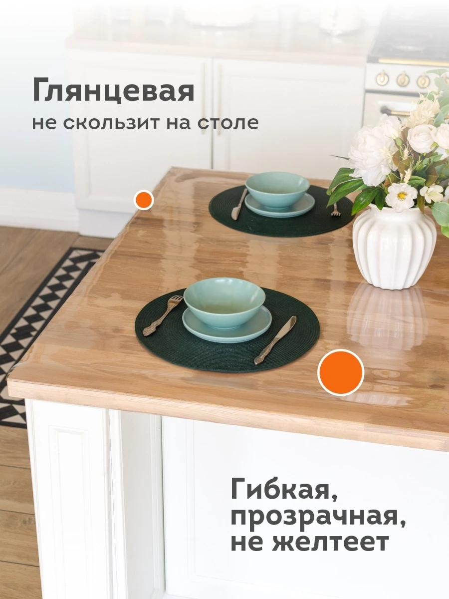 Надежно защитит любую поверхность из стекла, дерева, мрамора, пластика и других материалов от царапин, загрязнений и влаги. Не соскальзывает и не топорщится, как обычные скатерти, обладает шумоизоляционным и противоскользящим эффектом.