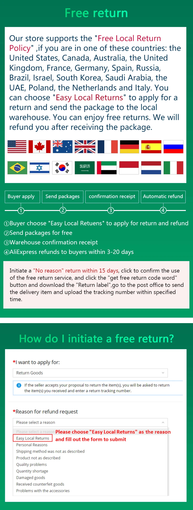 1. Продукция высочайшего качества, поэтому, если вы не довольны приобретенным товаром, пожалуйста, свяжитесь с нашей службой поддержки клиентов. Как можно скорее. Мы сможем помочь вам с любыми возвратами и возмещением средств в зависимости от состояния товара.