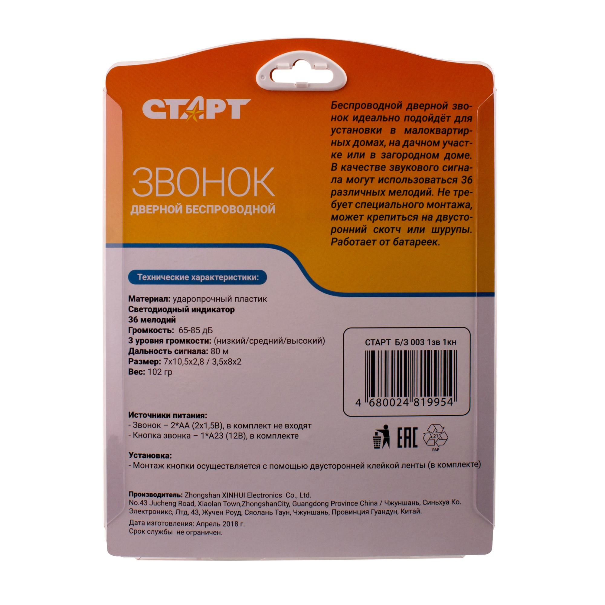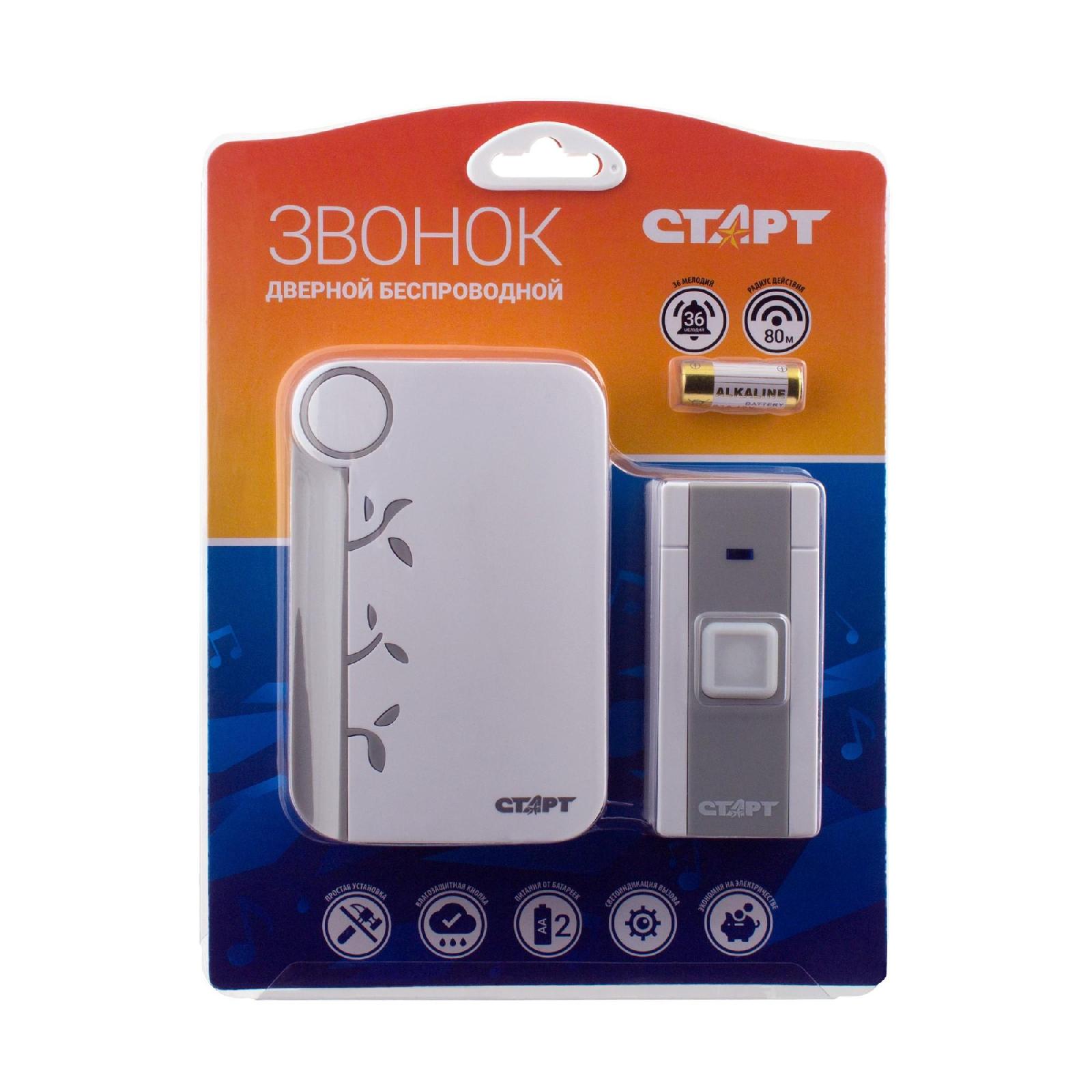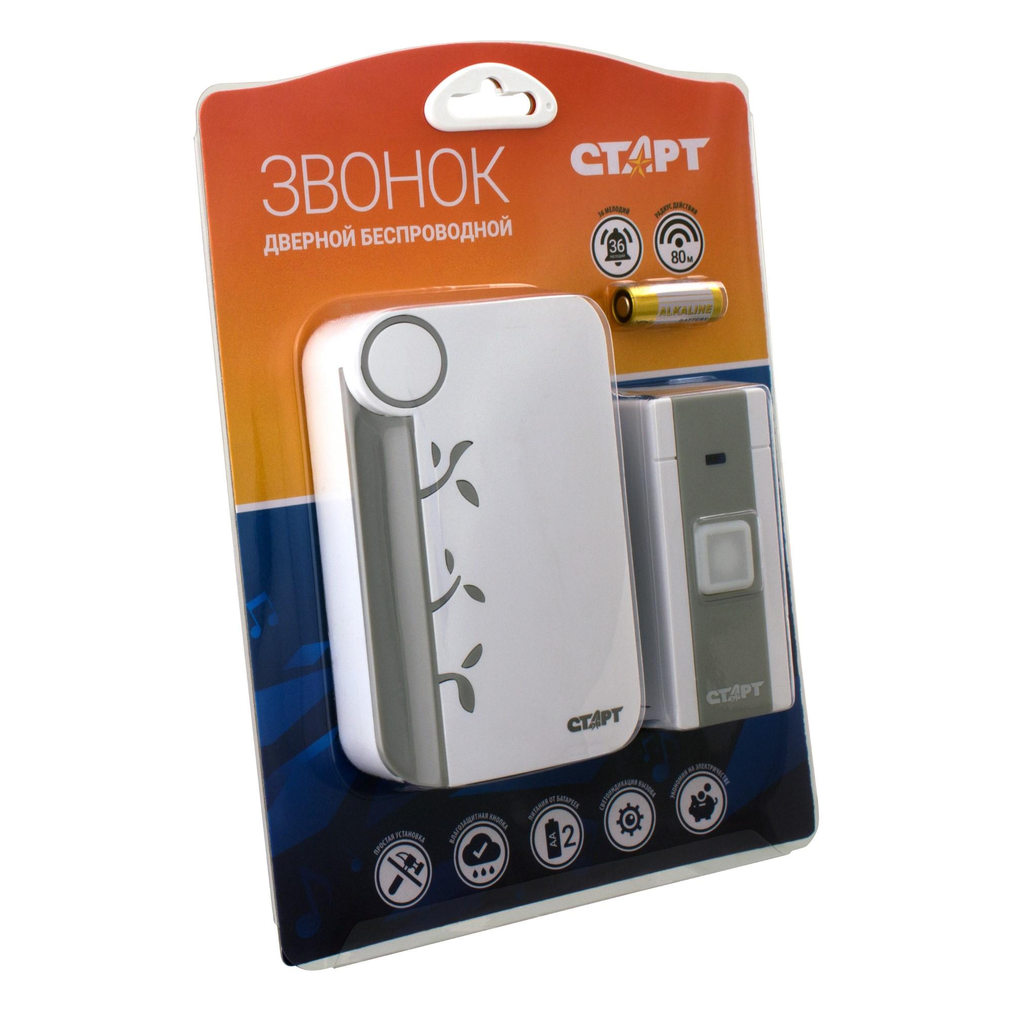 В компактном беспроводном устройстве СТАРТ звонок 003, действующим в радиусе до 100 м, Вы можете установить любую из 36-ти мелодий, устраивающий Вас уровень громкости, при этом разместив миниатюрный динамик хоть на книжной полке в Вашей спальной.
