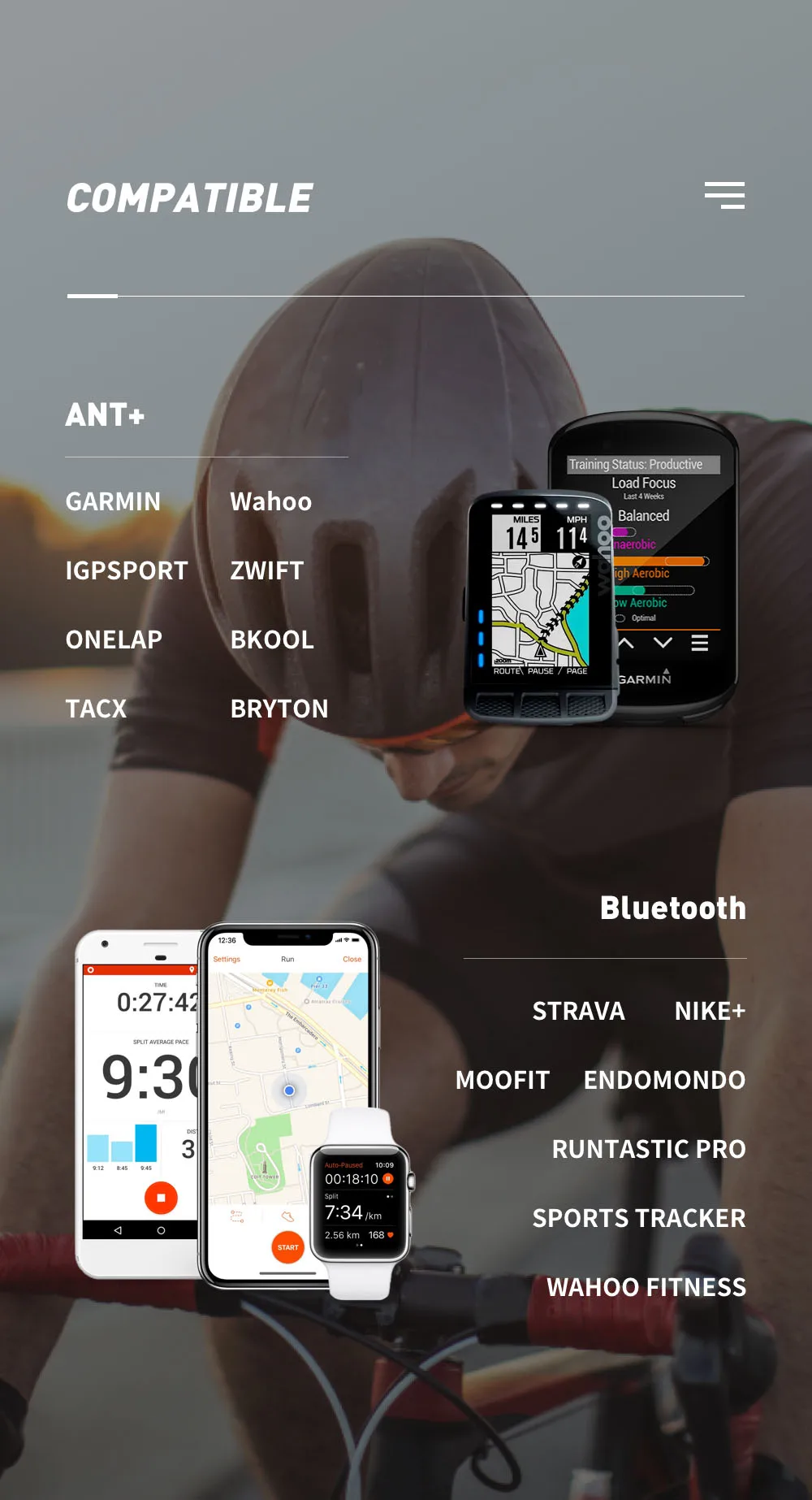 1. Двойная система передачи (ANT + / Bluetooth) совместима с широко используемыми устройствами ANT + и Bluetooth!