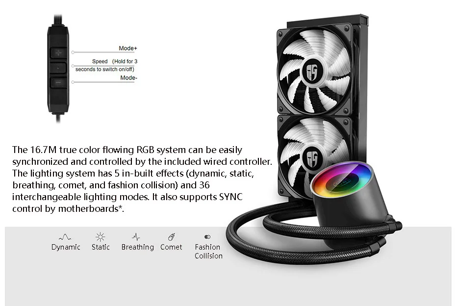 Технология защиты от протечек внутри системы охлаждения жидкости. Двойные оконные панели и иммерсивное окружающее освещение готовы обеспечить идеальный дисплей эстетического освещения. 16,7 М true color, RGB течет светильник система с 5 Встроенный эффектов и 36 сменный светильник ing режима. Материнская плата и контроллер адресуемых RGB синхронизация управления поддерживается * Сверхбольшой блок процессора из чистой меди обеспечивает эффективное покрытие и рассеивание тепла для процессоров любого размера. Оптимизированный e-образный микроводный канал предназначен для эффективного повышения эффективности циркуляции тепла и увеличения площади тепловых контактов. Керамические подшипники осей и сердечники осей гарантируют Сверхдолгий срок службы. Поддержка основного монтажа гнезда INTEL и AMD, включая TR4/AM4. * WS2812B ADD-RGB светодиод применяется, и ниже 3pin ADD-RGB заголовки совместимы для устройства: 5 В/D/G и 5 В/D/NC/G, который используется для основных брендов M/B, таких как ASUS, MSI, Gigabyte.