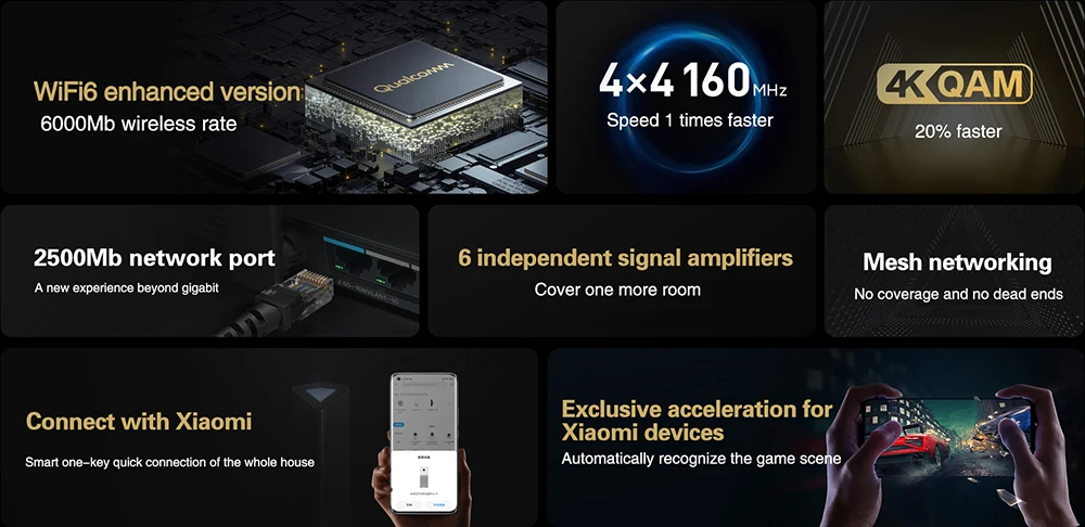 * 6000 м скорость беспроводной Спецификация уровень роутера, в том числе 2,4G Частотный диапазон скорости 574 Мбит/с, 5G Частотный диапазон скорости 4804 Мбит/с и AIoT антенна скорость 583 Мбит/с.