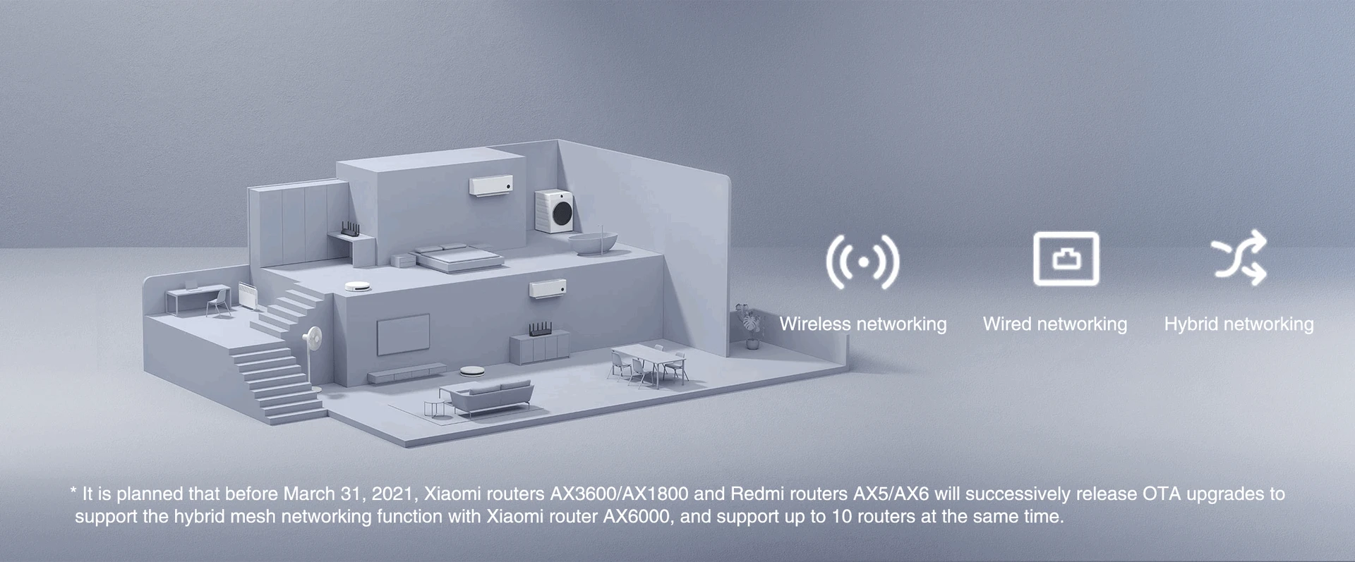 Многоэтажная квартира не боится, весь дом WiFi сигнала не имеет мертвый угол покрытия. Технология Mesh позволяет нескольким AX6000s создать сеть сетки, которая может покрыть весь дом супер сильными сигналами, будь то большая квартира или несколько этажей. Устройство может автоматически перемещаться между несколькими маршрутизаторами и играть без задержек во время ходьбы.(* Перед 31 марта 2021 года Xiaomi routers AX3600/AX1800 и Redmi routers AX5/AX6 последовательно выпускают обновления OTA для поддержки гибридной сетчатой сетевой функции с Xiaomi router AX6000, И поддерживает до 10 маршрутизаторов одновременно. )