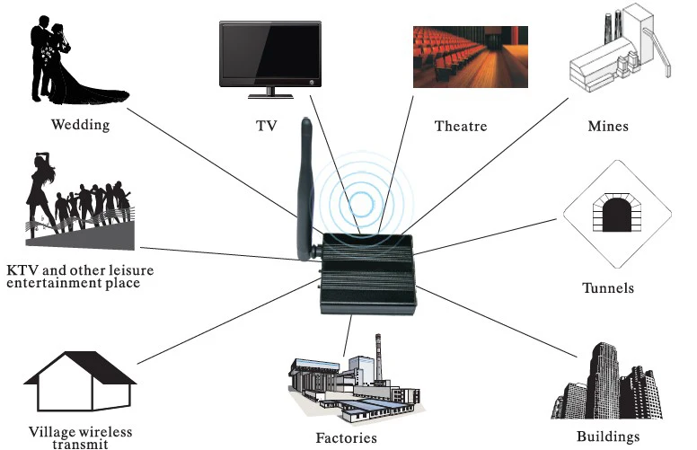 3. Внутренняя батарея встроена в передатчик для удаленного использования. Переключатель уровня мощности передачи (Высокий/низкий). Доступный стереоаудиовход на передатчике.