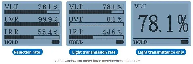 6. Детектор тонирования окна имеет функцию блокировки данных. Нажмите кнопку удерживания после тестирования, данные останутся на интерфейсе после снятия проверенных материалов.