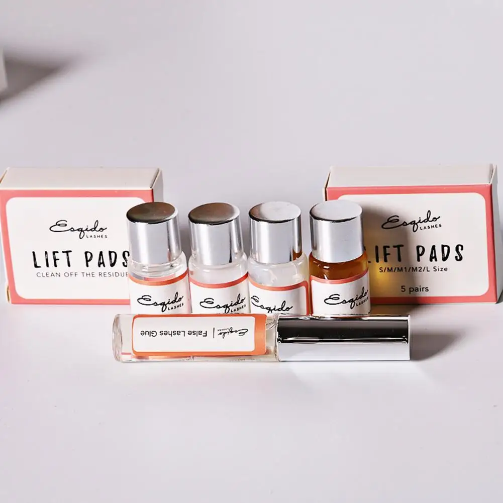 Набор включает в себя Пермь, фиксирующие, нутрицевтические, моющее средство, гель для накладных ресниц, чистящие средства и чистящие прокладки.