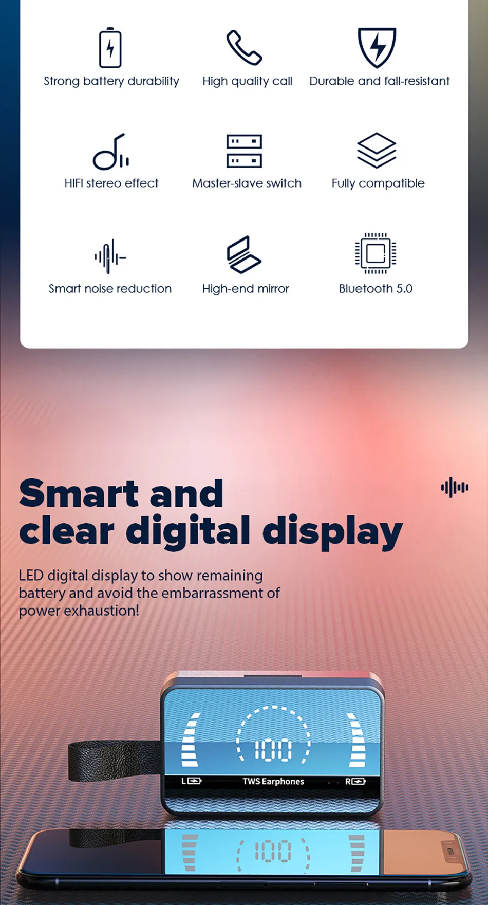 Особенности 1. Bluetooth 5,0, Поддержка большинства устройств bluetooth и более низкое энергопотребление 2. Чехол на 3500 мА · ч может полностью зарядить 2 наушника примерно 12 раз, обеспечивает более 50 часов прослушивания музыки 3. Благодаря водонепроницаемой технологии больше не нужно беспокоиться о воде и поте 4, 8MMS двойной дисковод, наслаждайтесь 9D сильными глубокими басами, музыкальный звук 5. Популярная функция сенсорного управления, поддержка переключения песен, телефонных звонков и голосовых вызовов. Списки аксессуаров: 2 * Bluetooth-наушники 1 * чехол для зарядки 1 * USB-кабель 1 * Руководство пользователя 3 * чашки для наушников (размеры S,M,L)