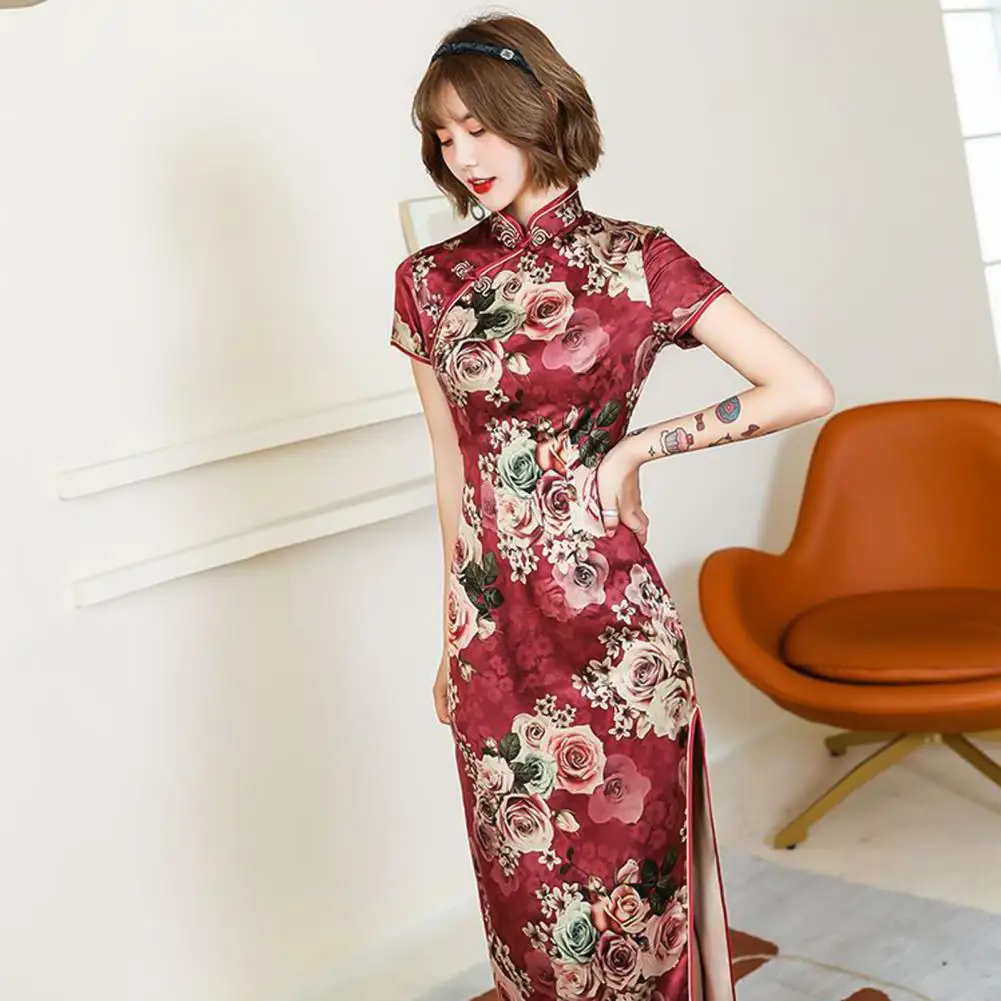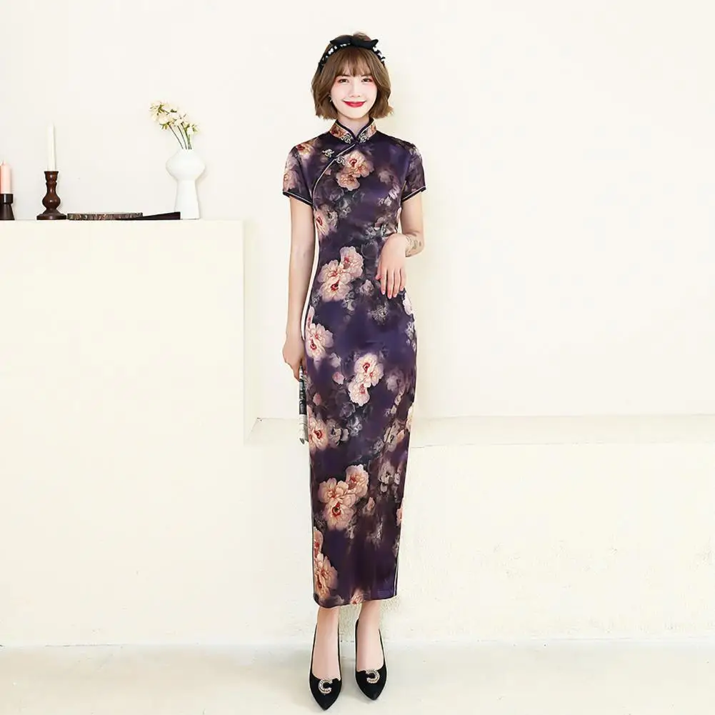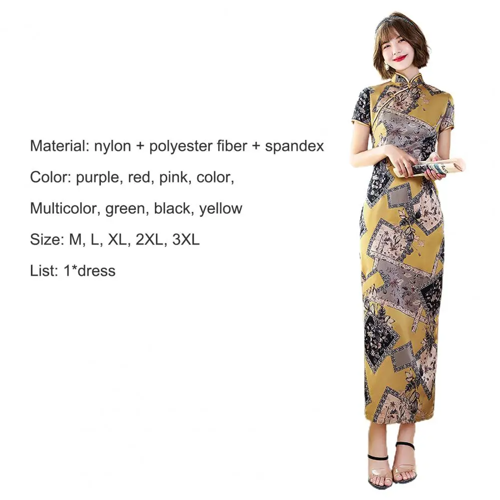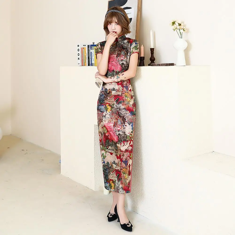 Женское платье Ципао с цветочным принтом, облегающее платье средней длины с коротким рукавом, вечерние платья