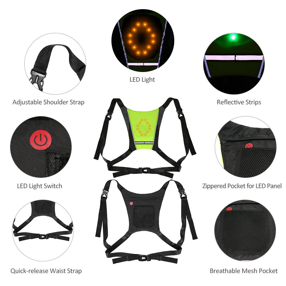 2. Регулируемый и легкий в носке светоотражающий светодиодный легкий жилет имеет эластичную пряжку на ремешке, предназначенную для легкого включения и выключения, быстро снимается. И подходит для любого размера тела с регулируемой пряжкой. Это удивительный подарок-получите один для велосипедиста или бегуна, который вы хотите сохранить в безопасности.