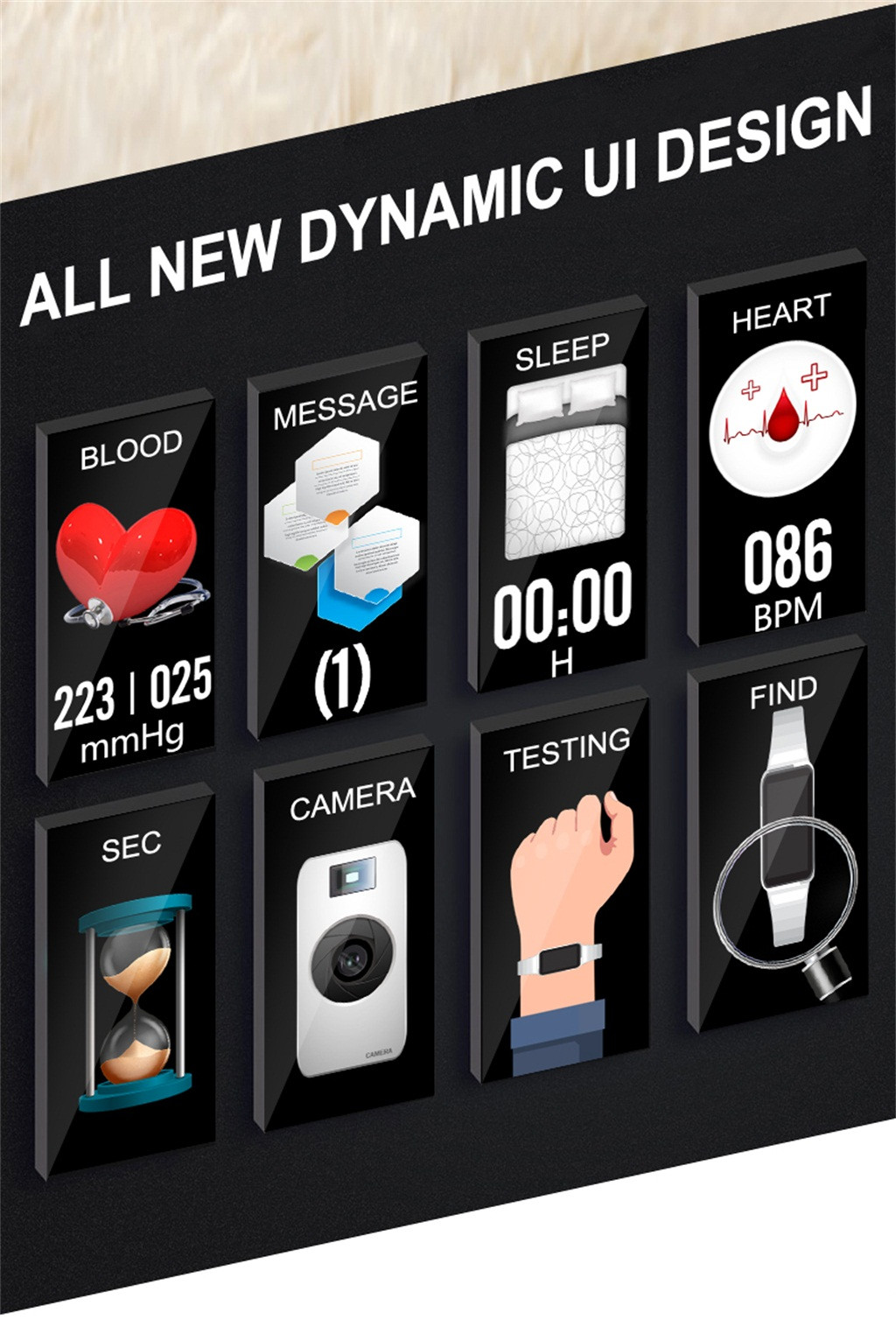 Отображение времени/часов, шаг, калории, расстояние, сон, камера, переключатель Дисплей ВКЛ/ВЫКЛ