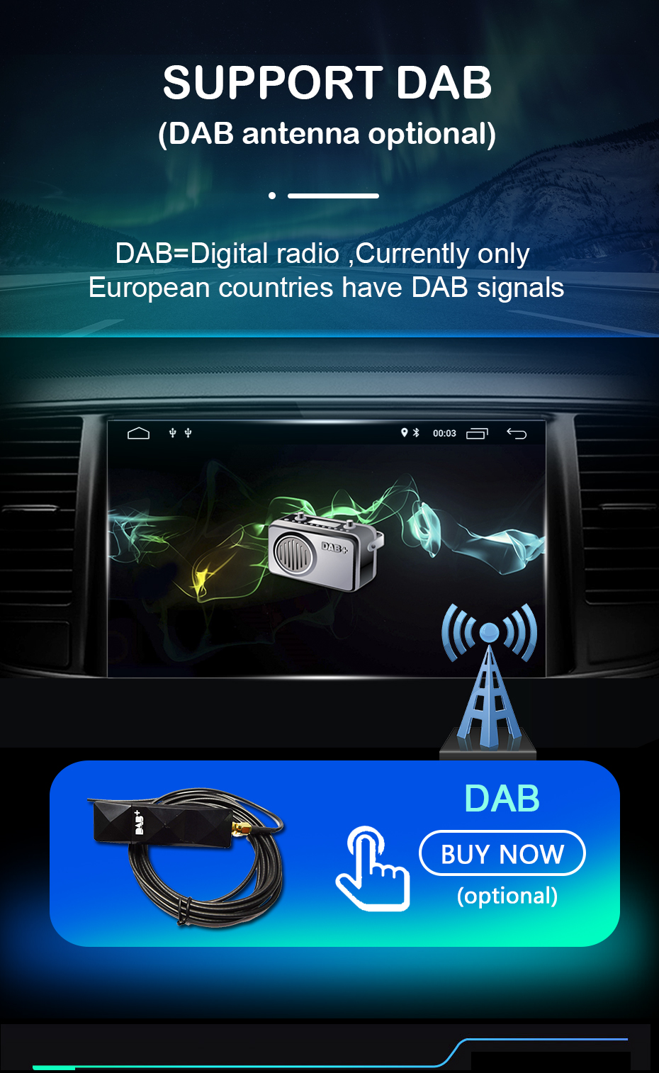 DAB DAB-Это цифровое радио. Если в вашем городе есть цифровой радиосигнал, мы предлагаем вам купить DAB антенну, это гораздо лучше, чем FM AM RDS, он работает идеально без шума. Если нет цифрового радиосигнала, пожалуйста, не покупайте его.