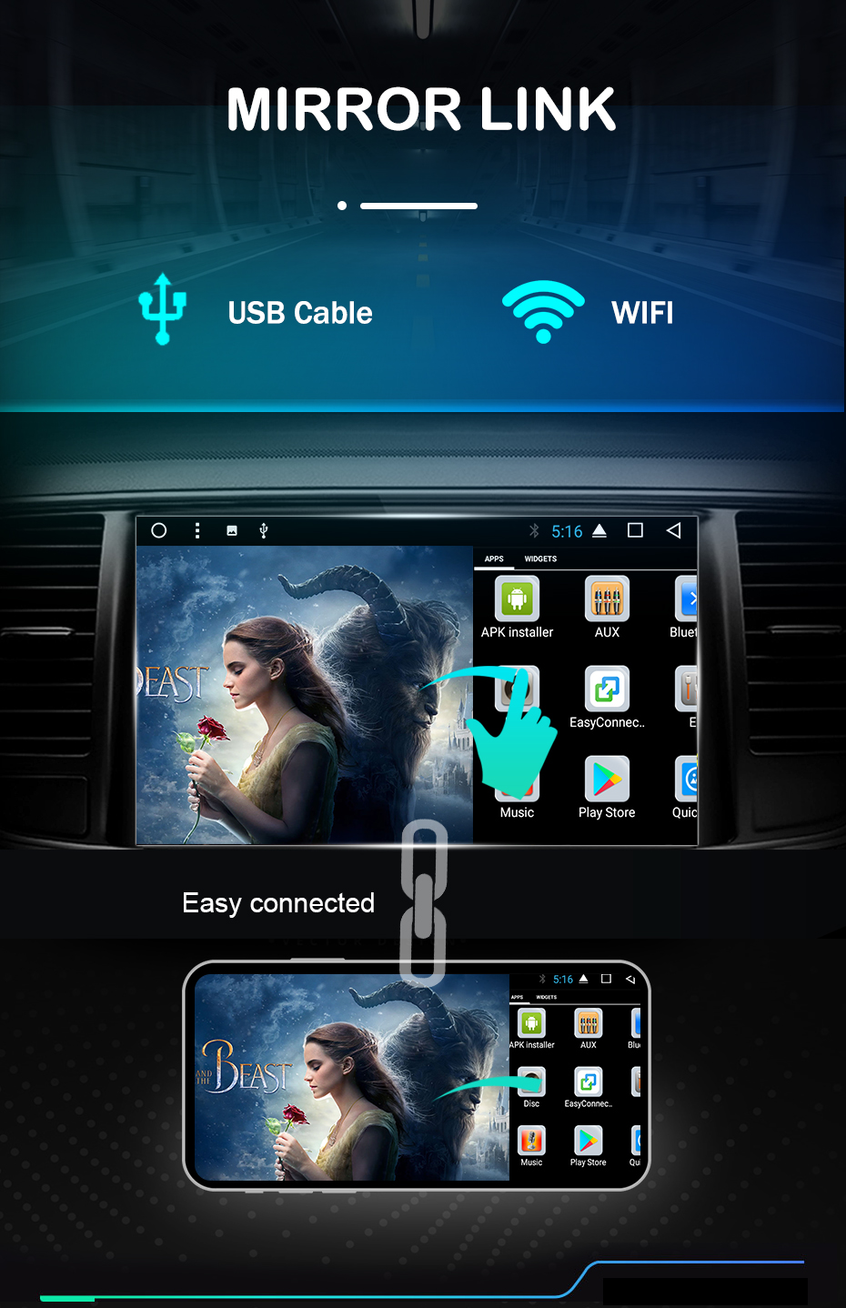 Зеркальная ссылка (приложение easyconnect) Подключите свой мобильный телефон к этому радио с помощью функции зеркальной связи, радиоэкран покажет изображение мобильного телефона, как зеркало. И радио может управлять вашим мобильным телефоном, так что вы можете слушать музыку мобильного телефона или совершать звонки через Радио экран после их подключения.