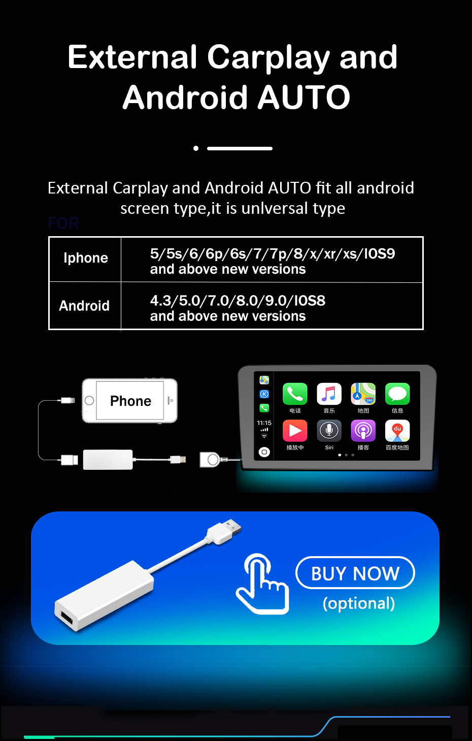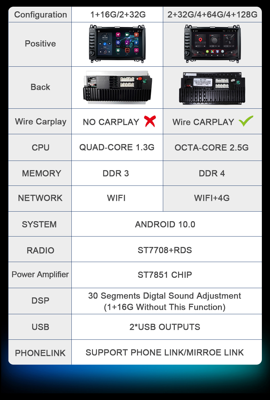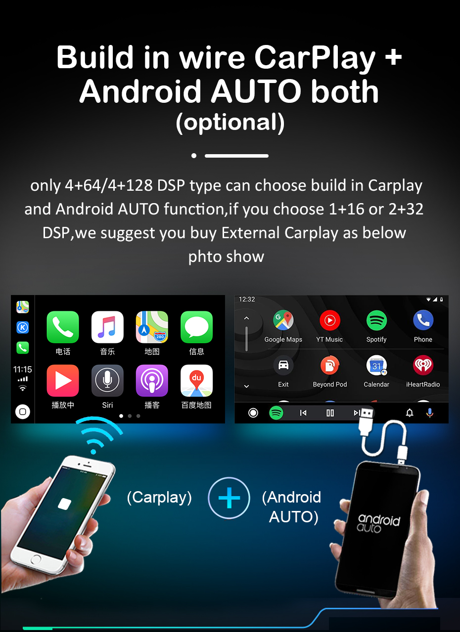 Встроенный провод CarPlay + Android AUTO оба (опционально) Только 4 + 64/4 + 128 DSP типа можно выбрать bulid в Carplay и Android Авто функции, если вы выбираете 1 + 16 или 2 + 32 DSP, мы предлагаем вам купить Внешний карлиай, как показано ниже.