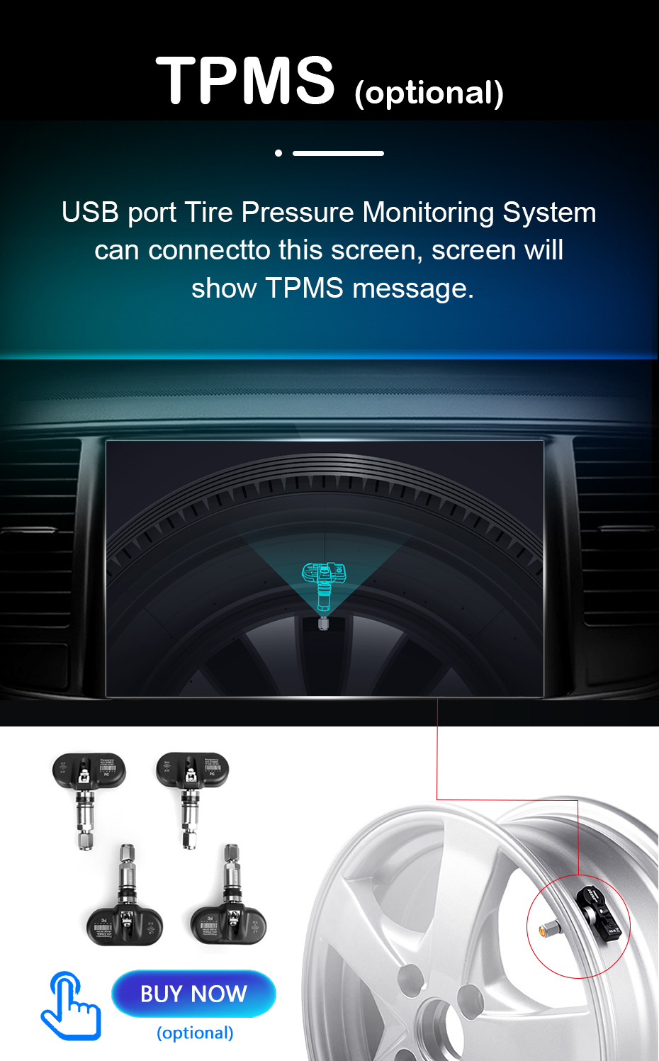 TPMS Радио может совместимо с системой контроля давления в шинах (TPMS). Когда вы подключаете TPMS к радио, вы можете видеть, что TPMS приводит к радиоэкрану. Радио также совместимо с внутренними TPMS и внешними TPMS. Если вы хотите купить TPMS, нажмите на эту фотографию.