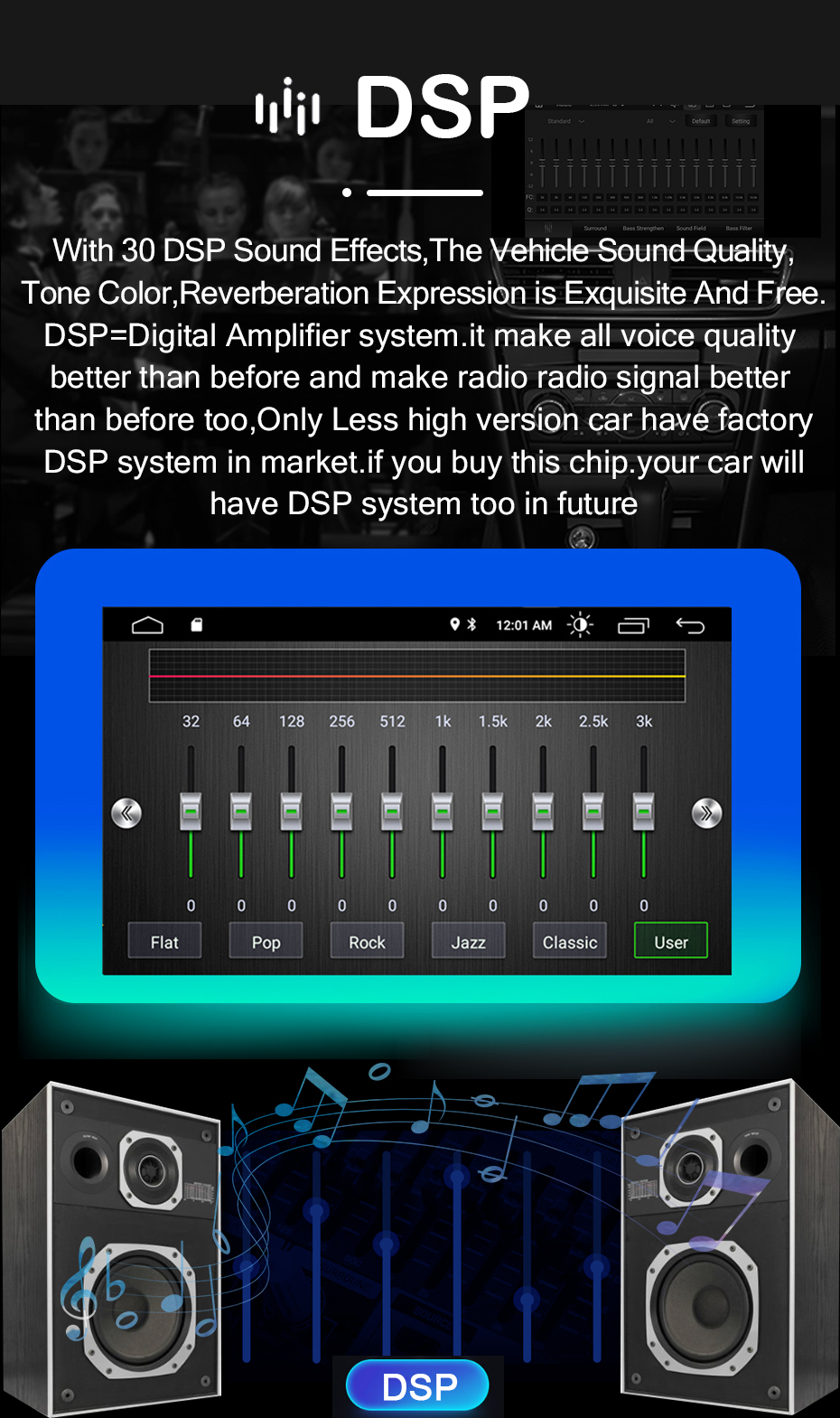DSP С 30 звуковыми эффектами DSP качество звука транспортного средства, цвет тона, выражение реверберации является изысканным и бесплатным. DSP = Система цифрового усилителя. Это делает все качество голоса лучше, чем раньше, и делает радиосигнал лучше, чем раньше, только менее высокая версия автомобиля имеет заводскую систему DSP на рынке. Если вы покупаете этот чип. В будущем у вашего автомобиля будет DSP система.