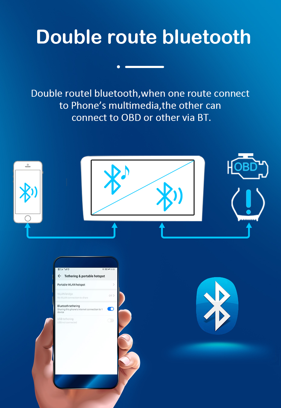 Двухканальный bluetooth Двойной маршрут bluetooth, когда один маршрут подключается к мультимедиа телефона, другой может подключаться к OBD или другому товару через Bluetooth