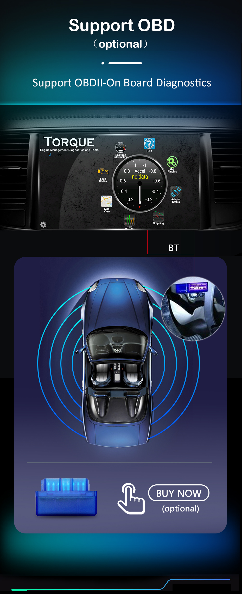 БД OBD-это бортовой диагностический прибор. Он подходит для всех android радио в нашем магазине, он также может отлично работать с нашим радио через bluetooth. Наше радио покажет результаты диагностики на странице ниже. Вам просто нужно nclick OBD app, а затем вы можете увидеть диагностический результат сообщения. OBD должен подключаться к автомобильному диагностическому порту, как показано ниже.