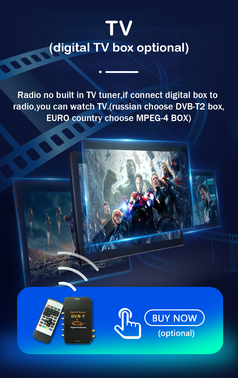 ТВ-бокс Если вы хотите смотреть телевизор на машине, вы можете купить 1 шт. цифровой ТВ-бокс. Если в вашем городе нет цифрового сигнала, не покупайте его. Российский покупатель должен выбрать DVB-T2, в вашей стране есть только DVB-T2-сигнал. Другие страны Европы должны выбрать цифровую коробку DVB-T MEPG-4. Пожалуйста, свяжитесь с нами перед оформлением заказа в другой стране.