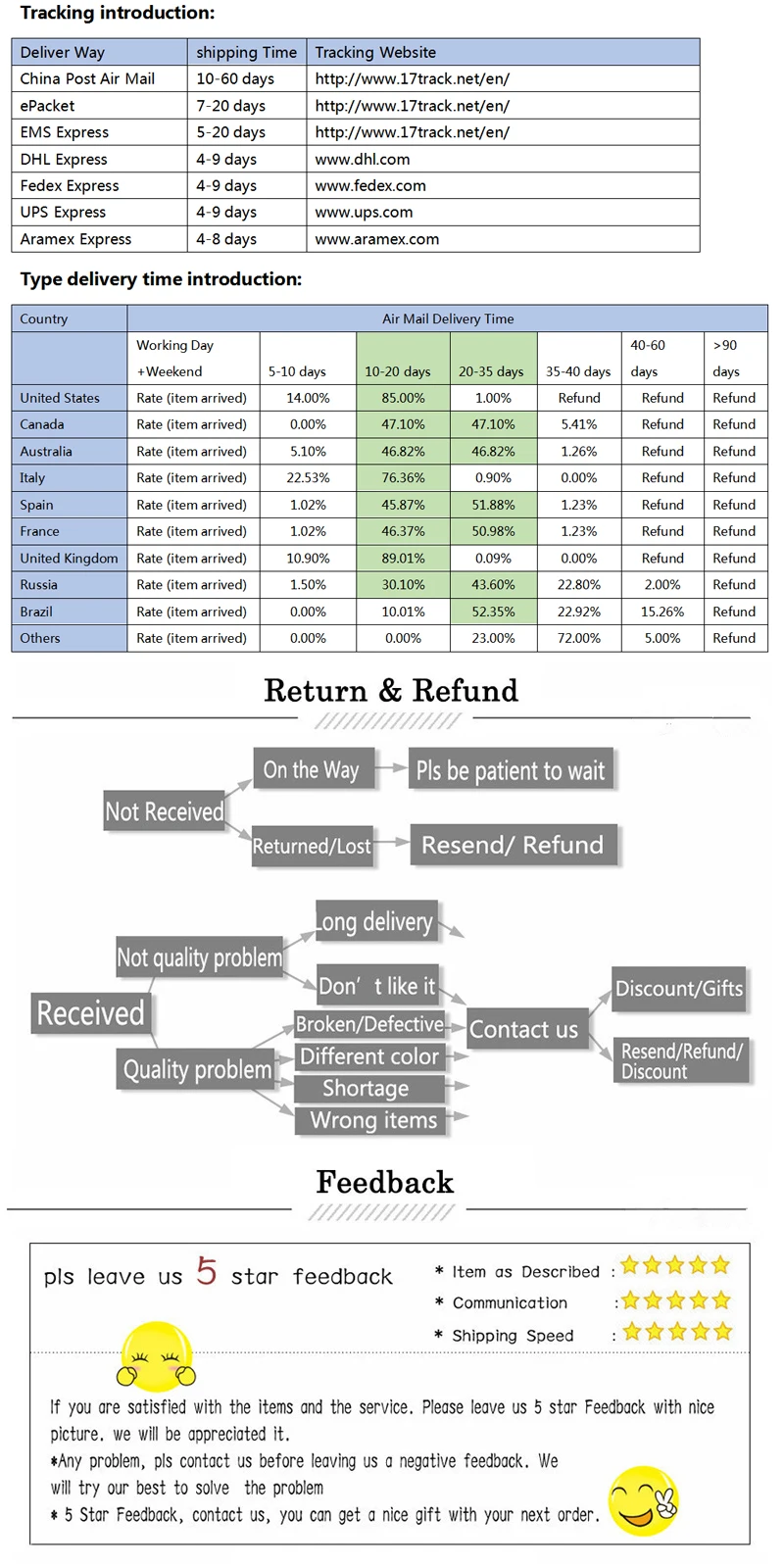 Удовлетворение ваших запросов и положительная обратная связь очень важны для нас. Пожалуйста, оставьте положительный отзывы и 5 звезд. Если вы остались недовольны качеством товара и обслуживания, не торопитесь подтверждать получение товара и писать негативный отзыв. Сначала свяжитесь с нами. Мы сделаем все возможное, чтобы решить проблемы и предоставить Вам лучшее обслуживание клиентов.