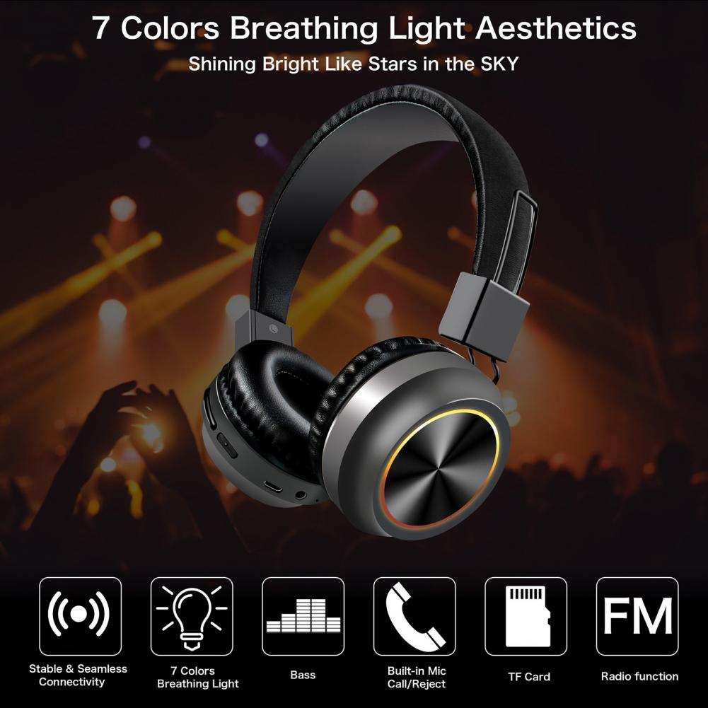 Яркий светодиодный светильник с ярким дизайном, семь цветов ламп меняются с ритмом музыки с обеих сторон bluetooth-гарнитуры, что делает прослушивание музыки более особенным и уникальным.