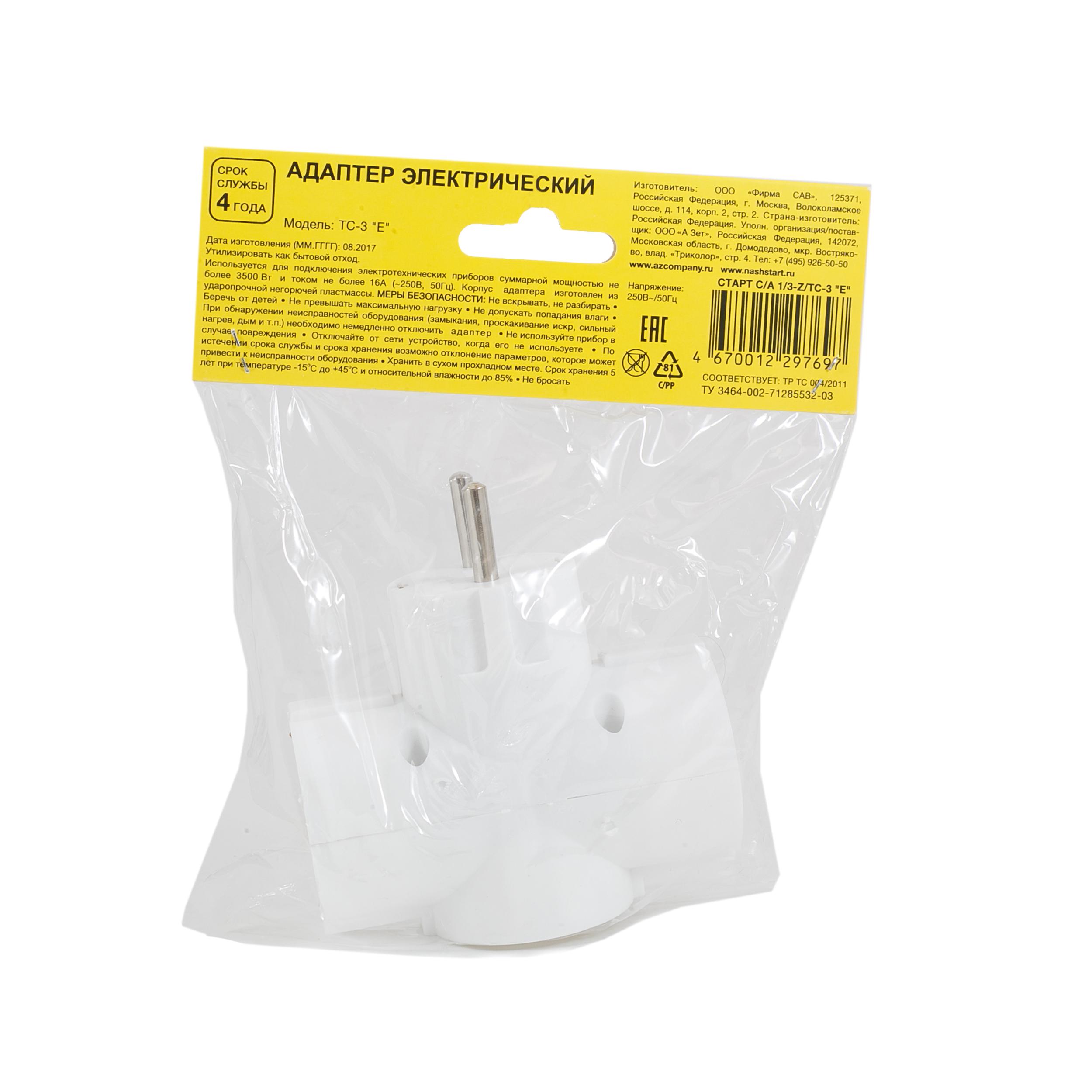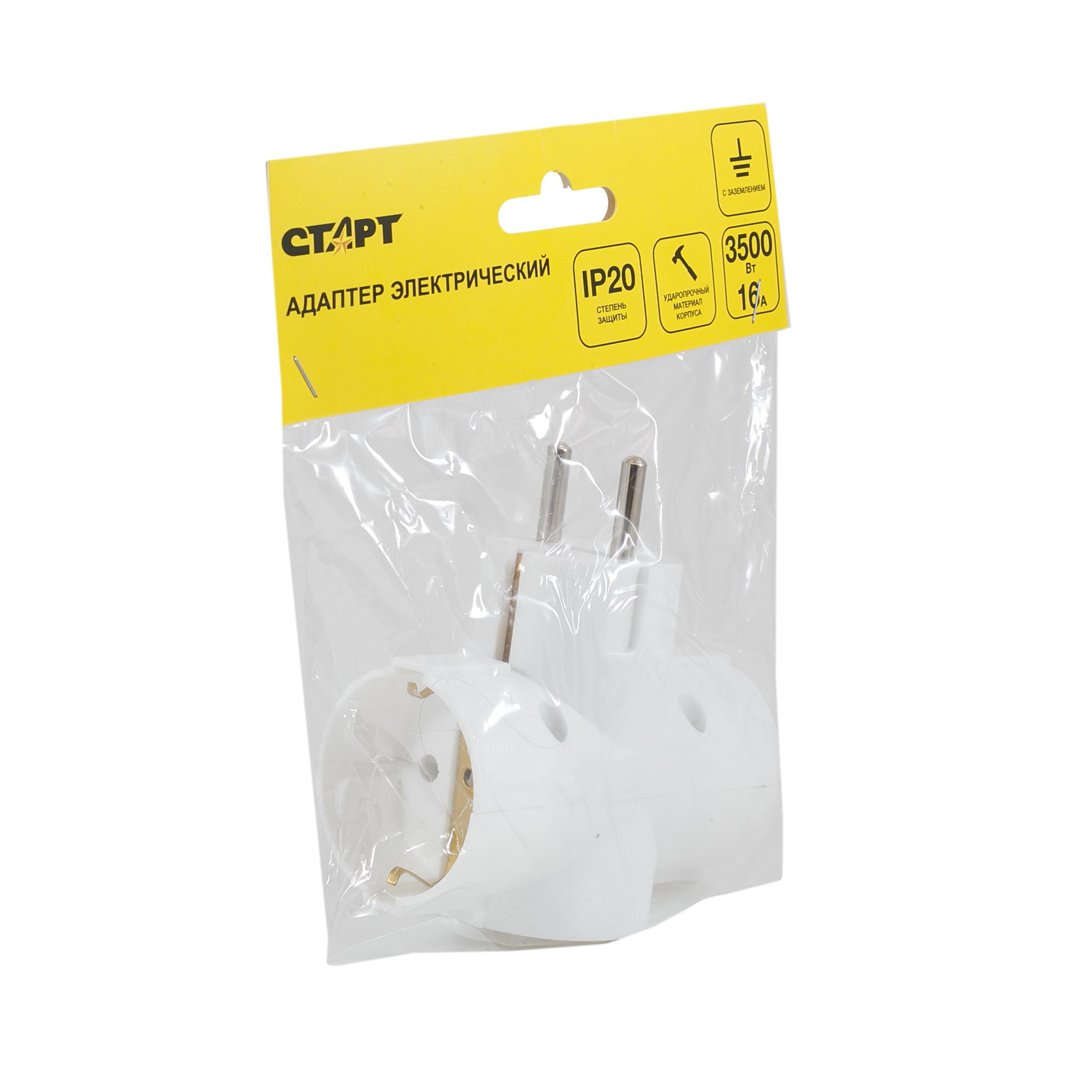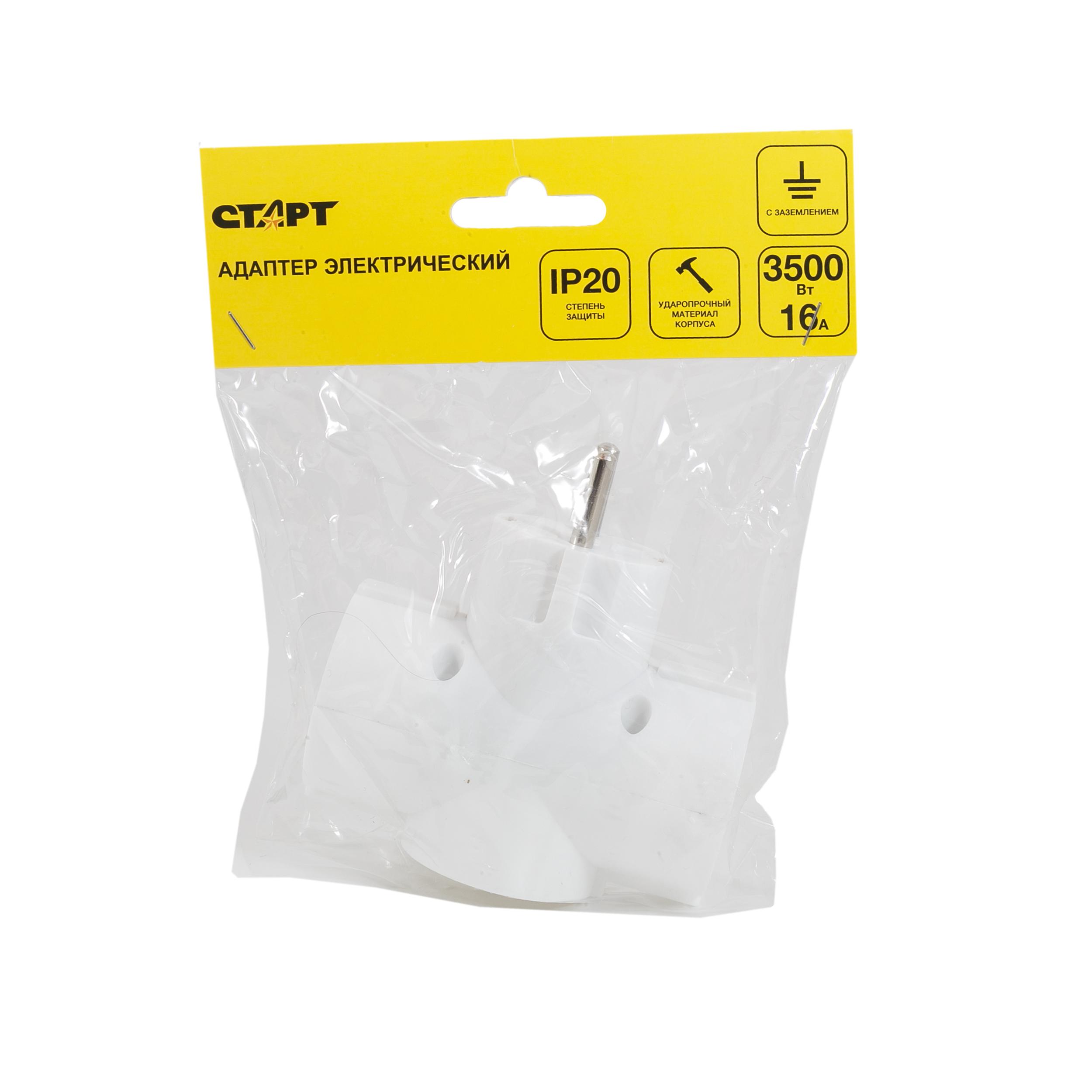 Сетевой адаптер СТАРТ рассчитан на подключение 3-х бытовых устройств с суммарной мощностью 3500Вт. Модель применяется для увеличения количества подключений электроприборов в местах, где стационарное питание ограничено одной розеткой. Форма адаптера – классический «тройник».