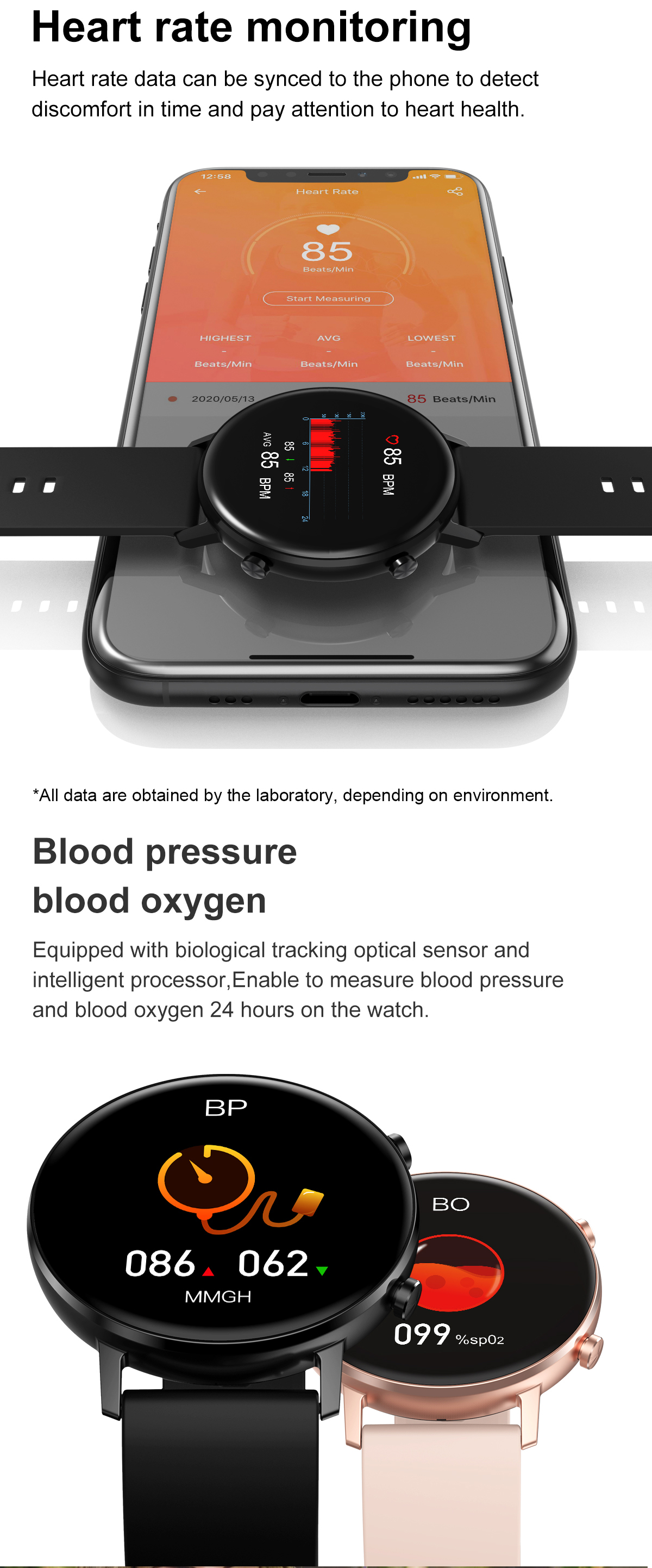 Оснащен оптическим датчиком биологического отслеживания и интеллектуальным процессором, позволяющим измерять кровяное давление и уровень кислорода в крови 24 часа на часах.