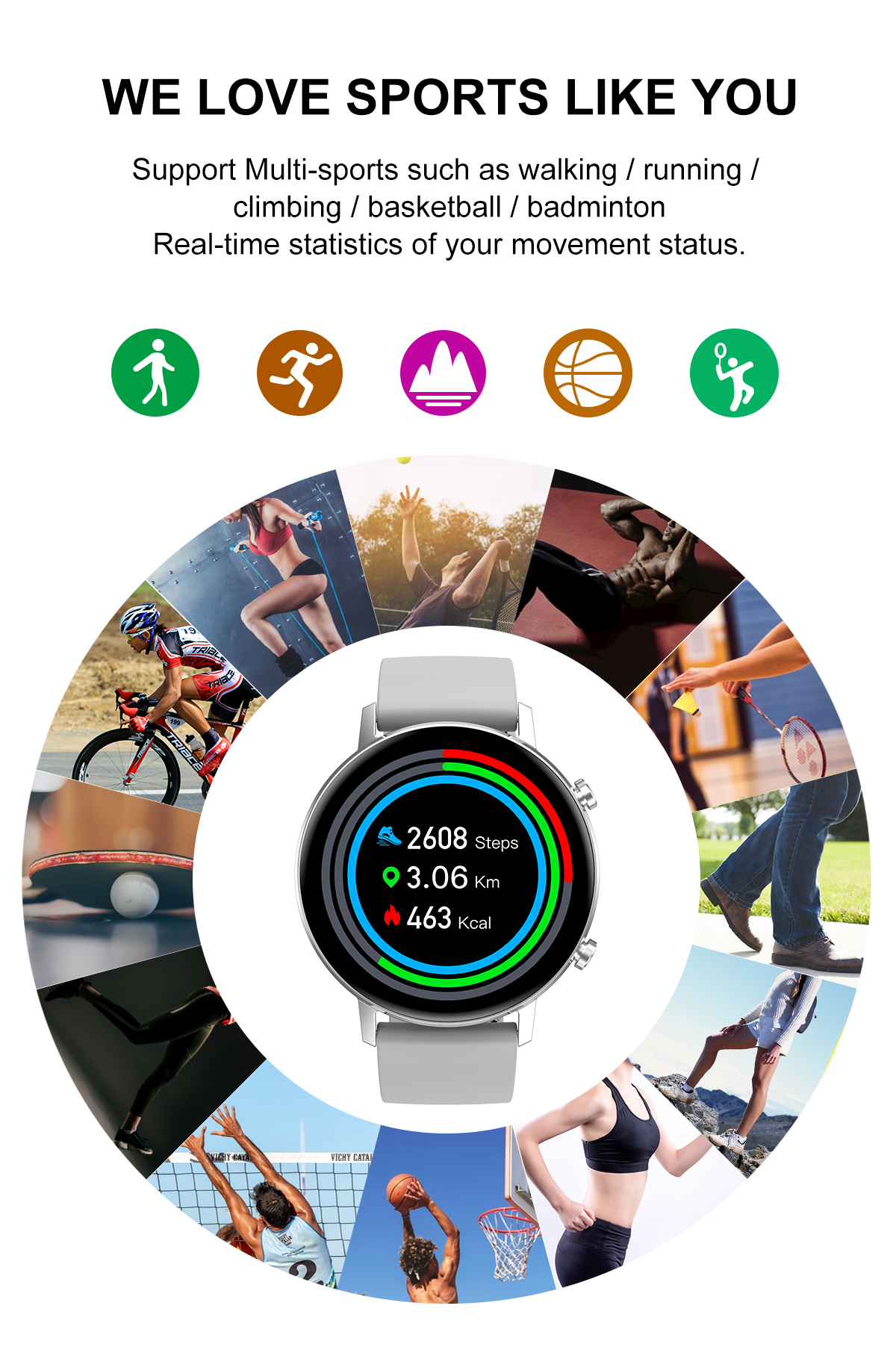 Поддержка нескольких видов спорта, таких как ходьба/бег/Скалолазание/Баскетбол/бадминтон в режиме реального времени статистики Вашего статуса движения.