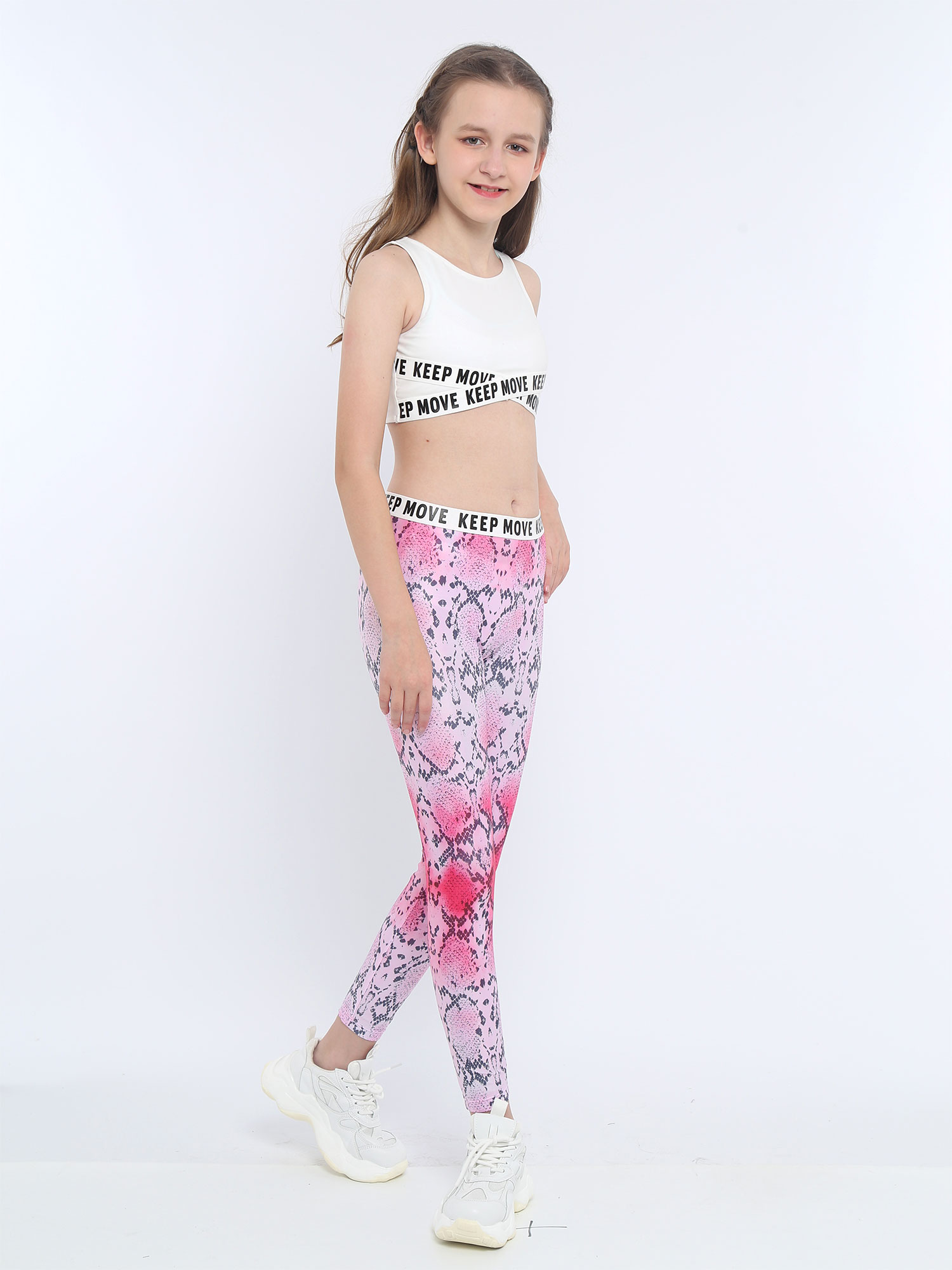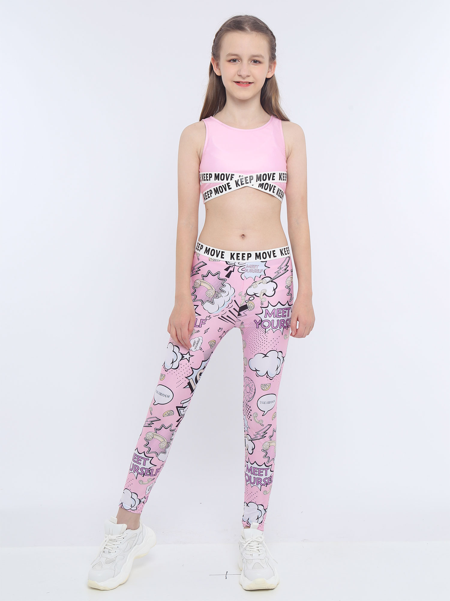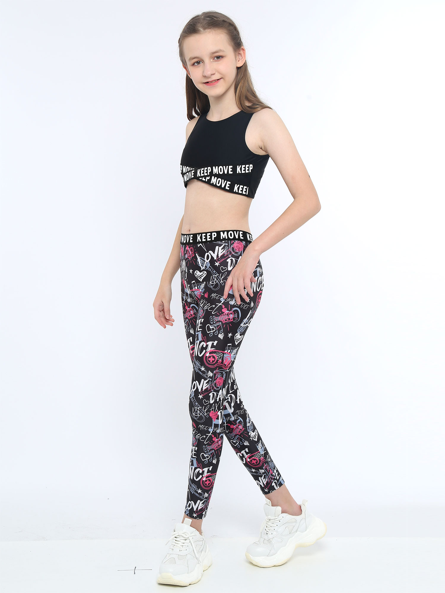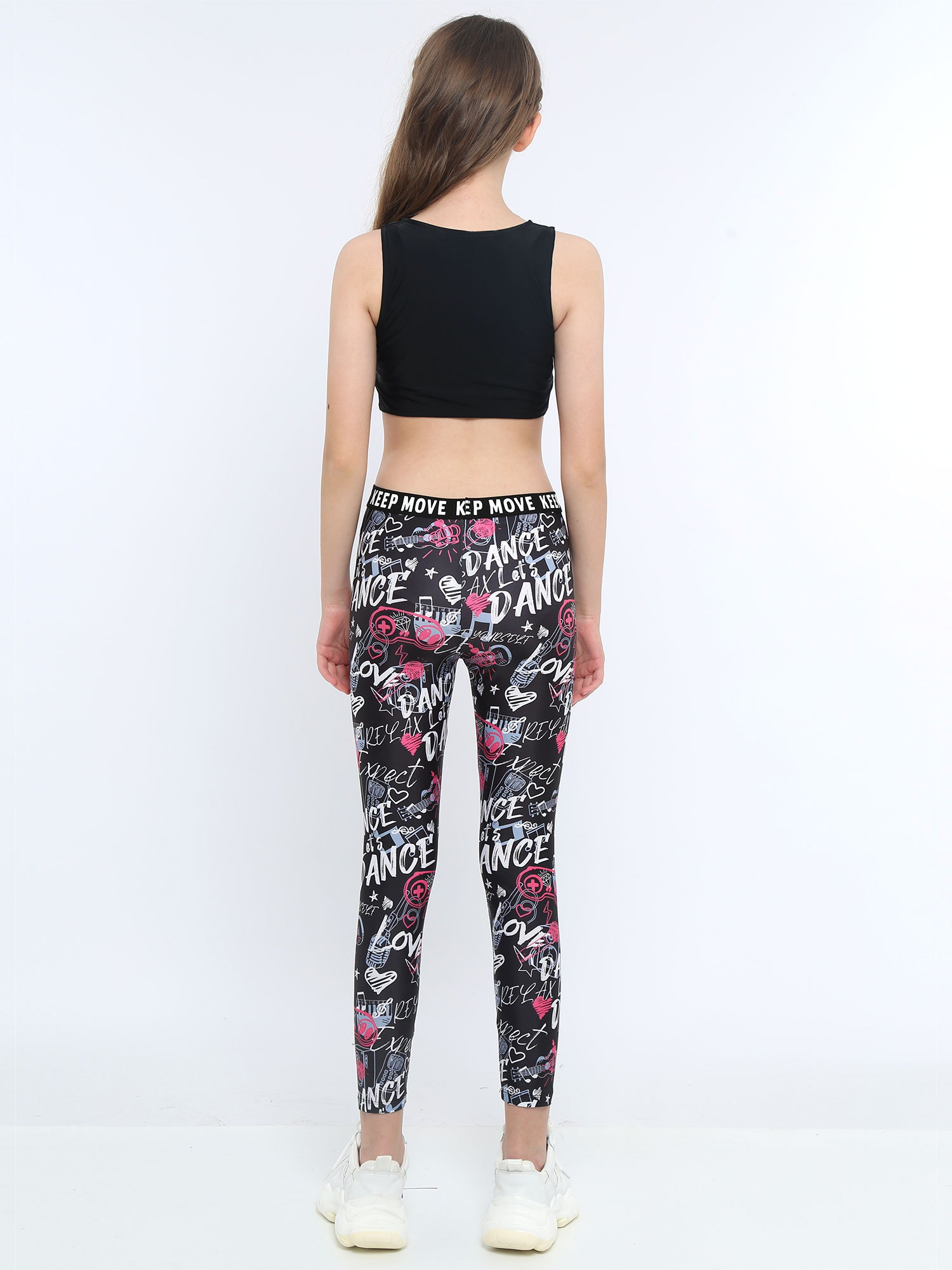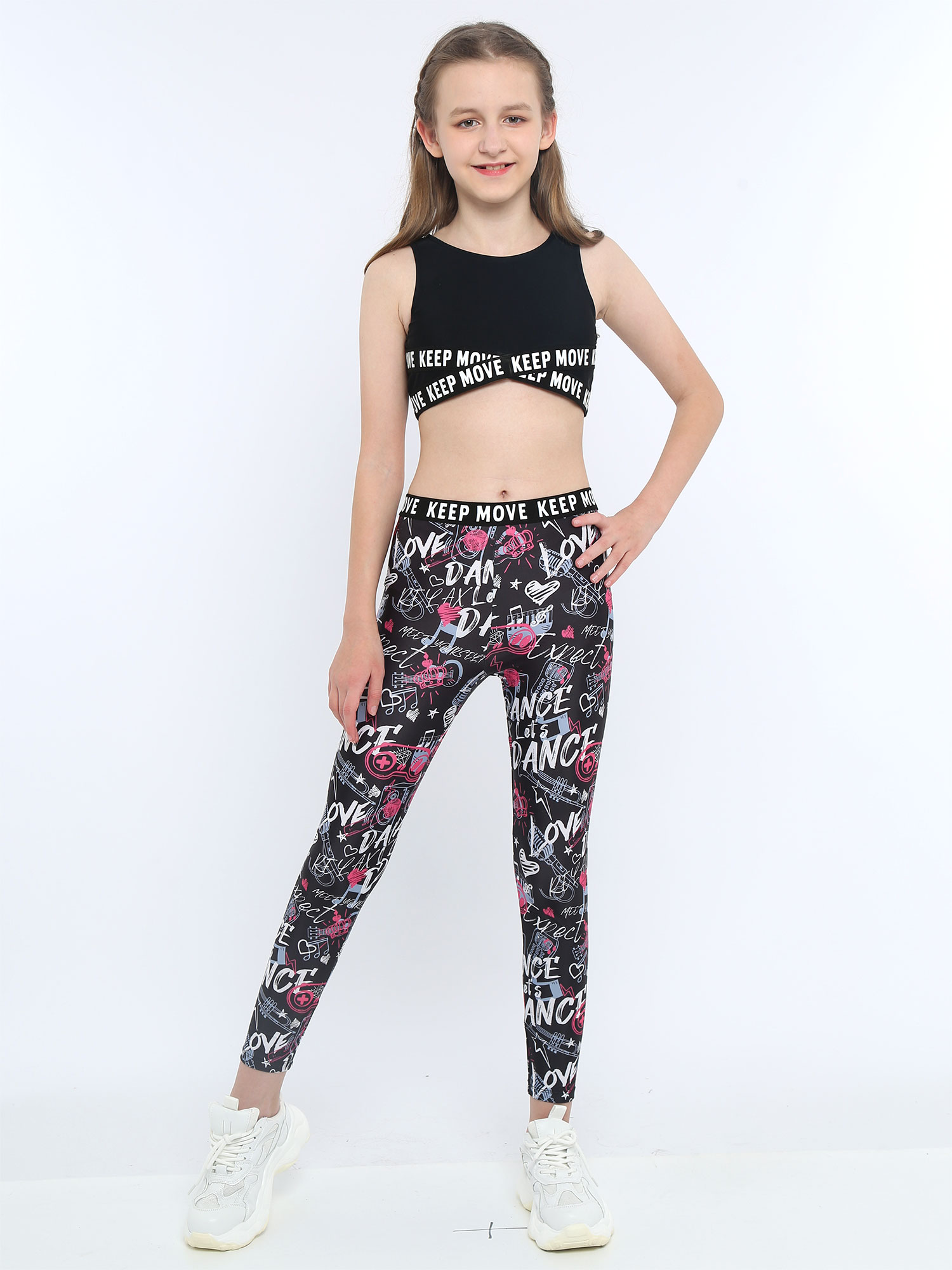 Комплект из укороченного топа без рукавов с круглым вырезом и буквенным принтом для девочек; Комплект со штанами с эластичным поясом и принтом.