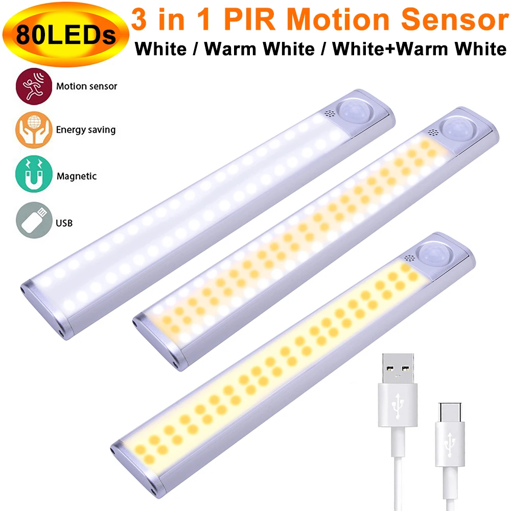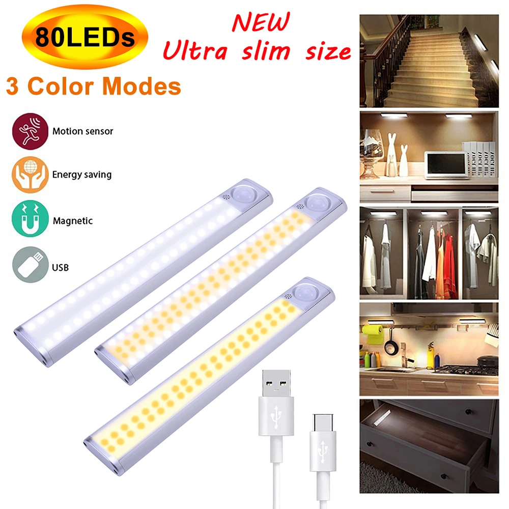 80 светодиодовUSB Перезаряжаемый PIR датчик движения светодиодный шкафСветильник 3 светильникЦветРежимы затемненияПортативный настенный светильник Жесткая полосы света светильник для шкафа Кухня шкаф 1/2/3 предмета в комплекте