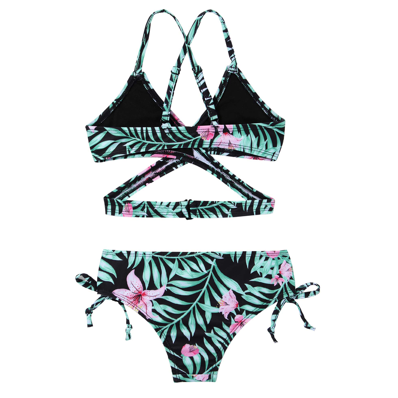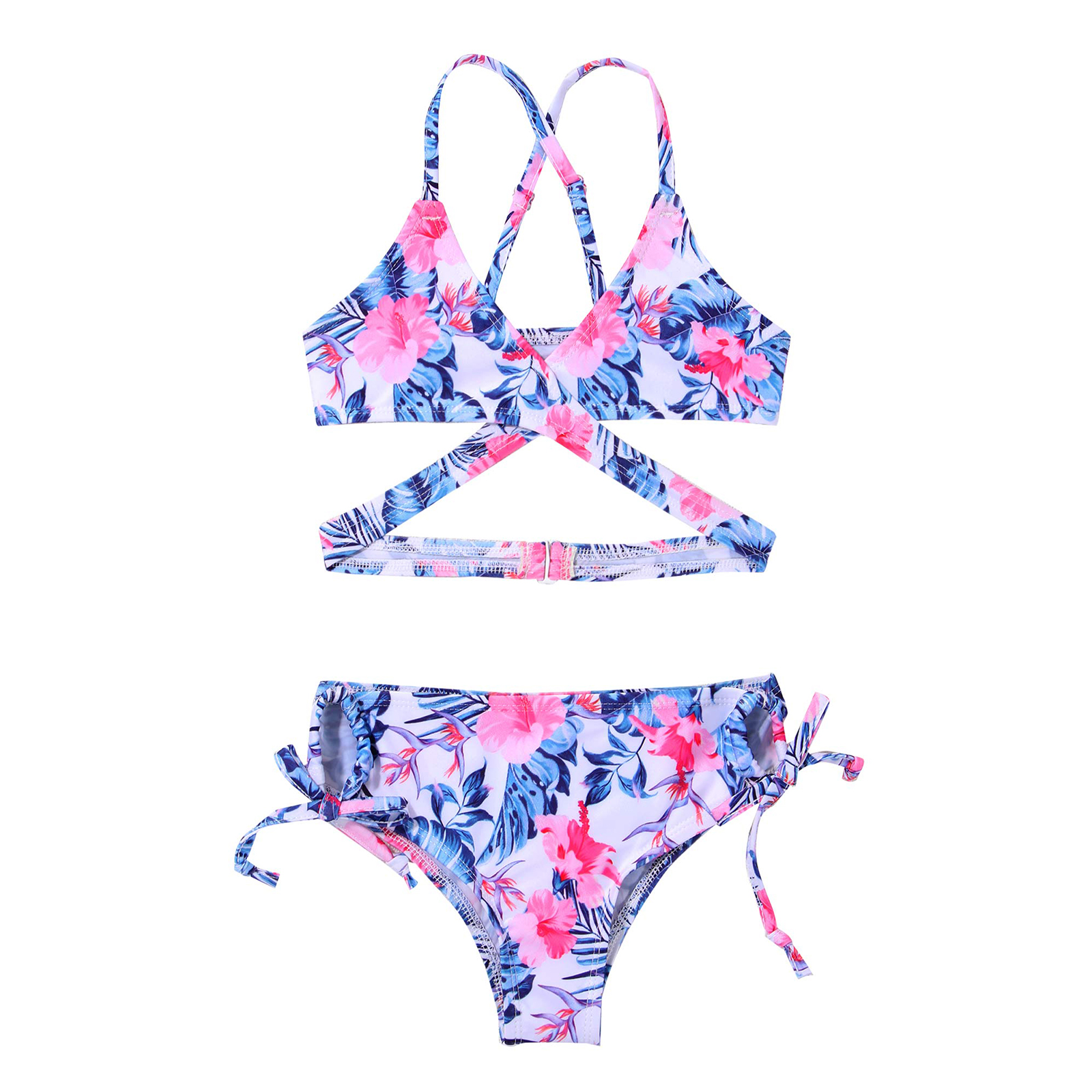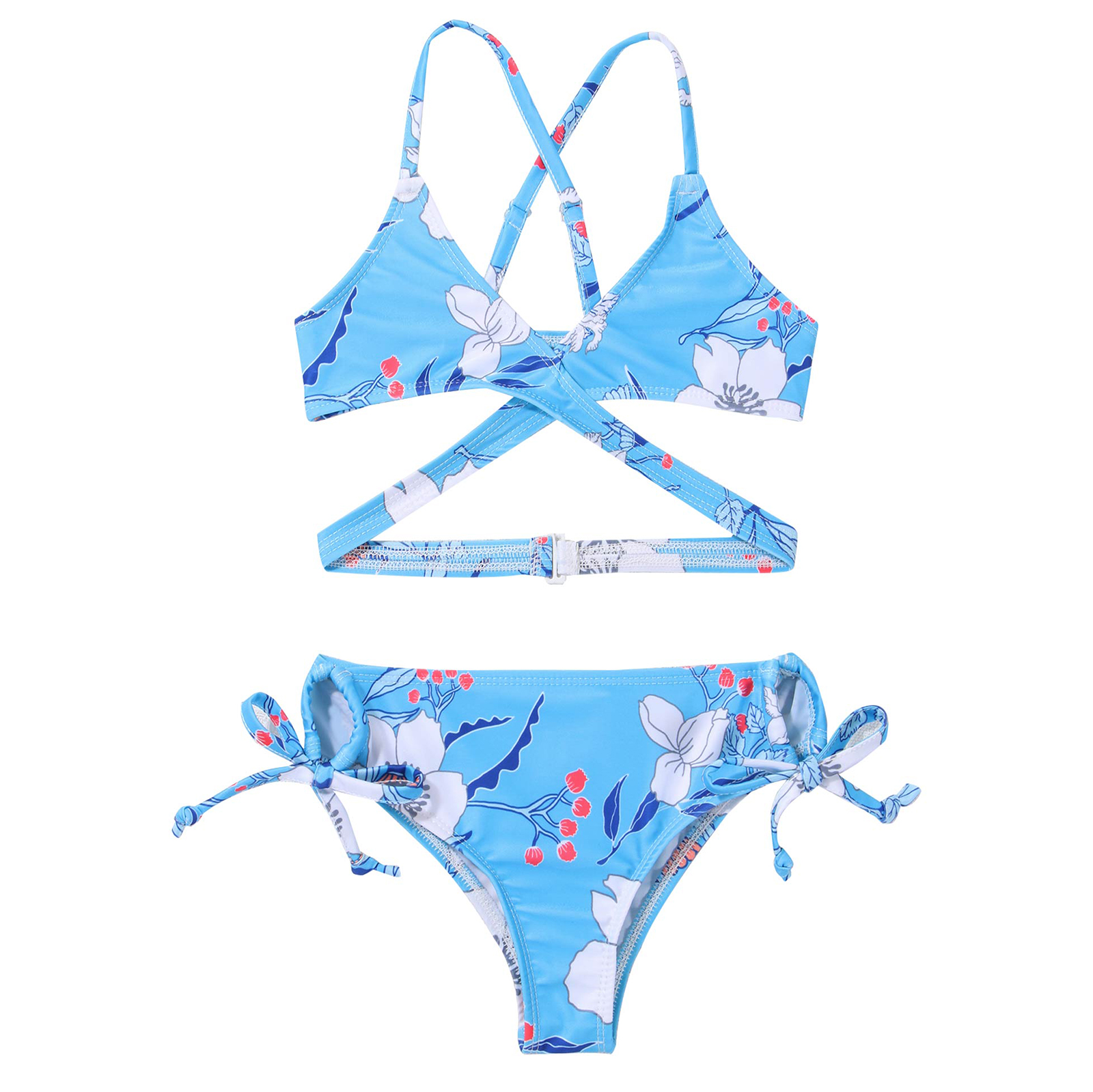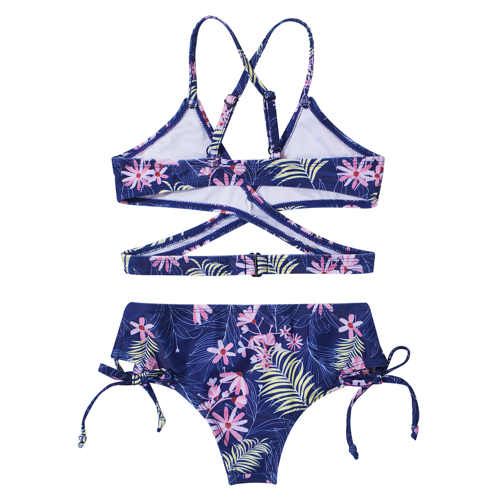 Бикини с цветочным принтом для девочек, с v-образным вырезом, регулируемые бретельки на бретельках, крест-накрест сзади, треугольный бюстгальтер на бретельках, застежка-зажим, низкая талия, короткий шнурок сбоку.