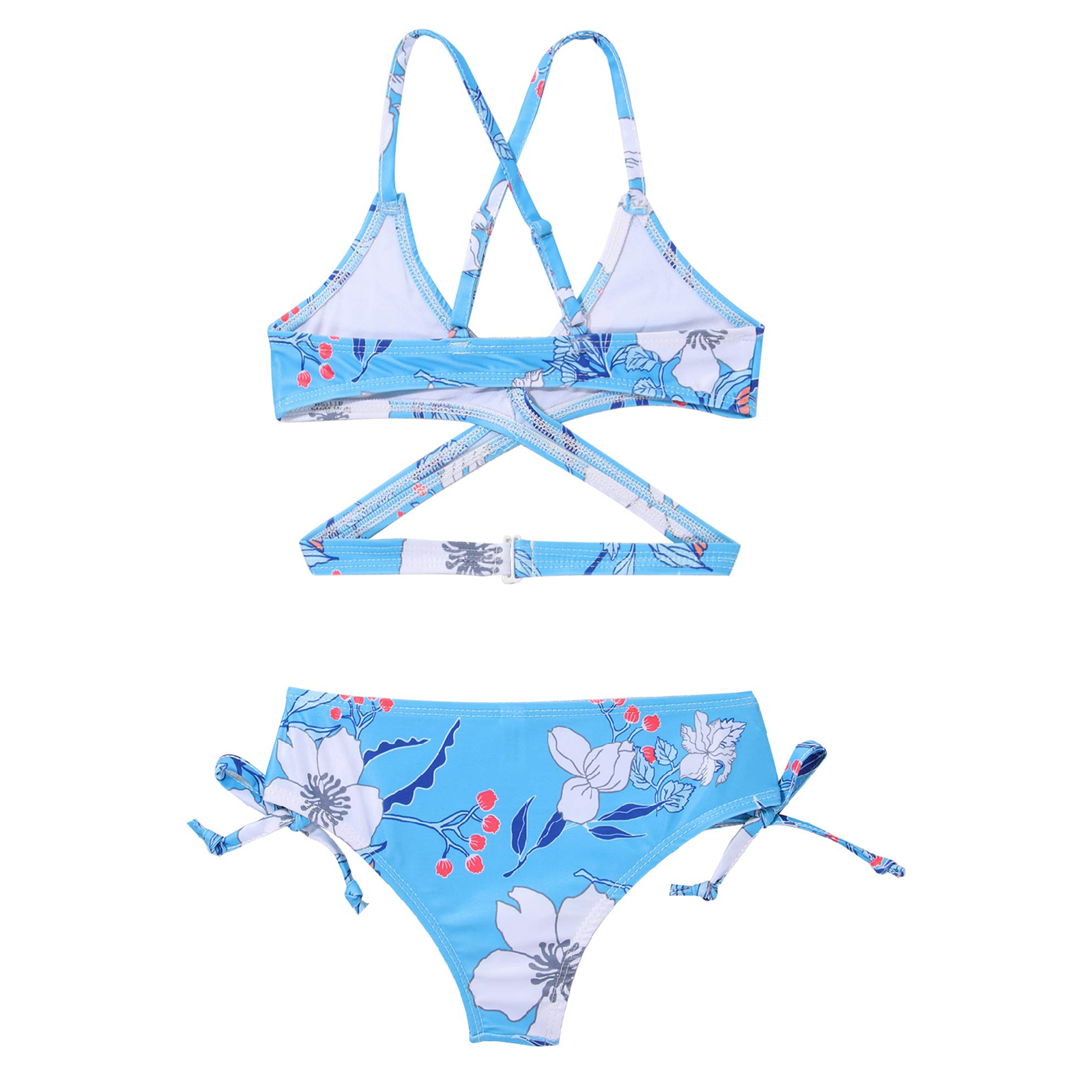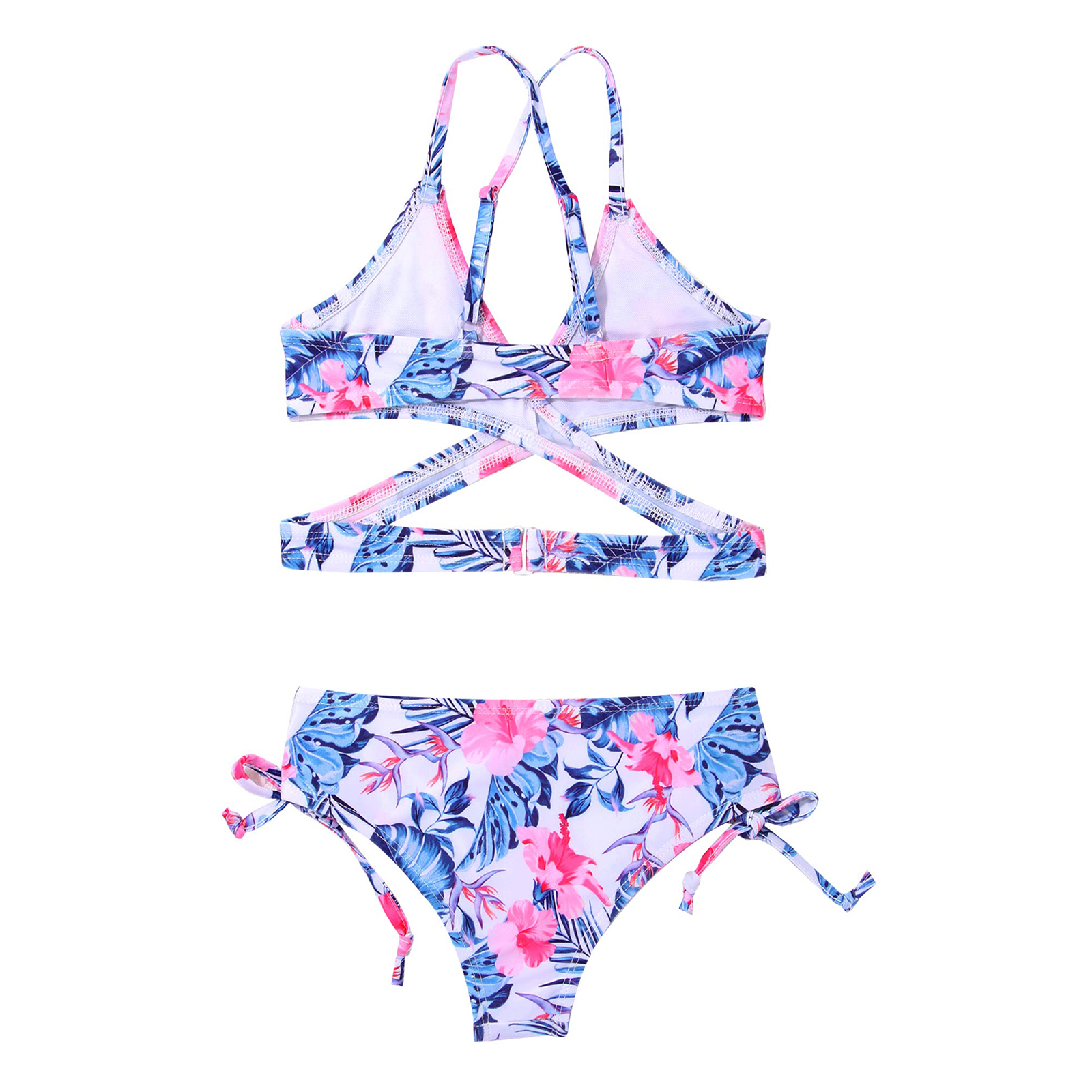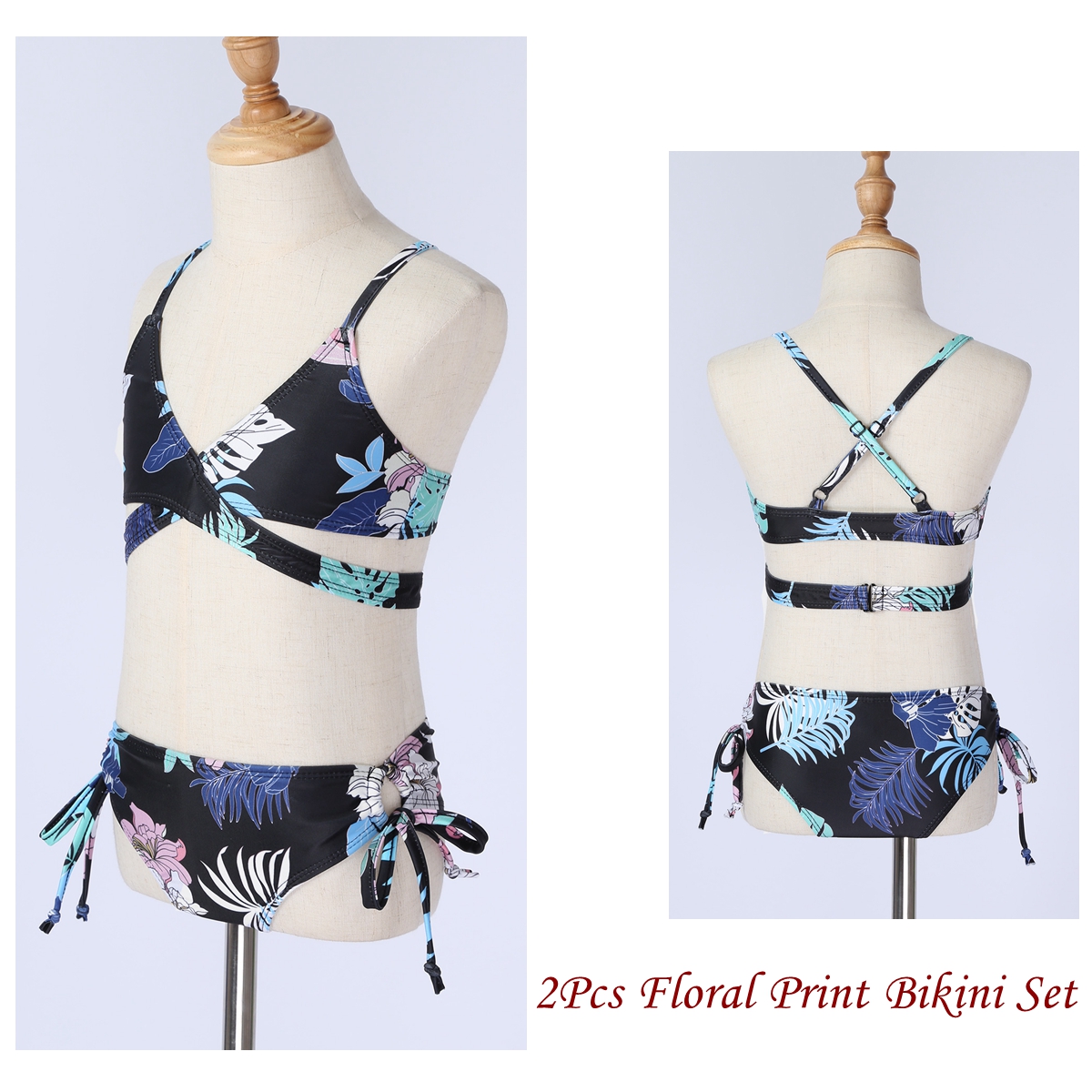 Бикини с цветочным принтом для девочек, с v-образным вырезом, регулируемые бретельки на бретельках, крест-накрест сзади, треугольный бюстгальтер на бретельках, застежка-зажим, низкая талия, короткий шнурок сбоку.