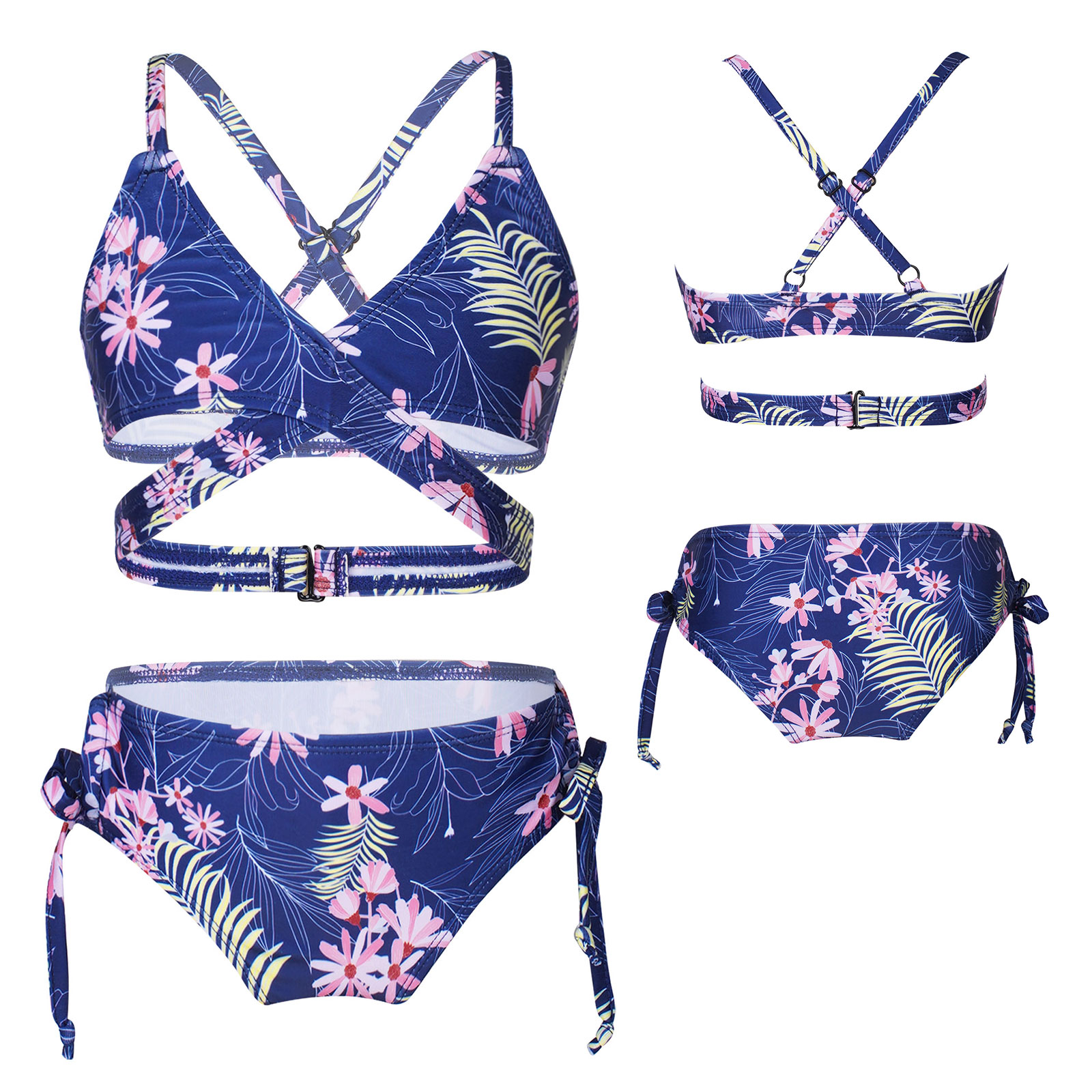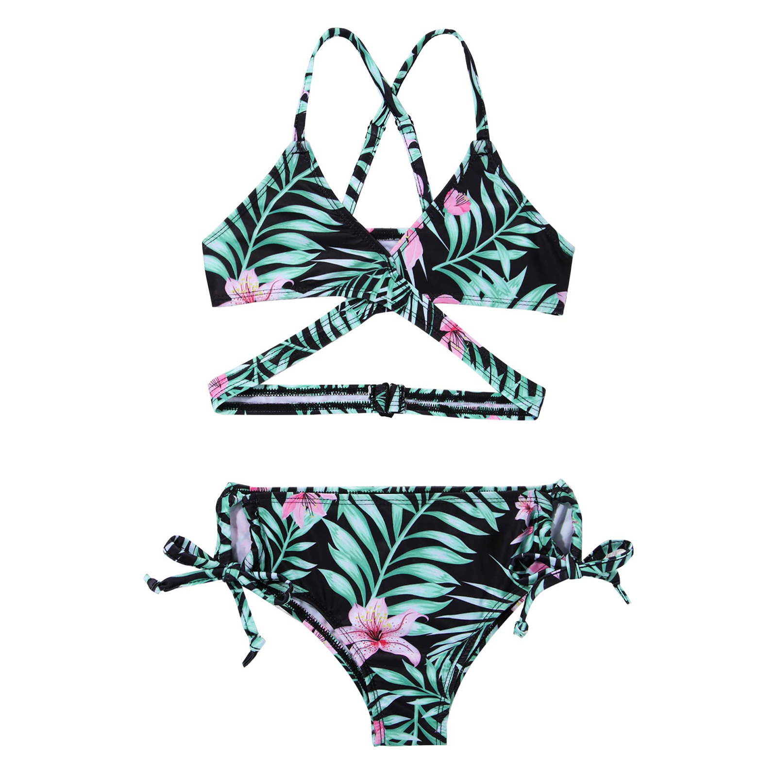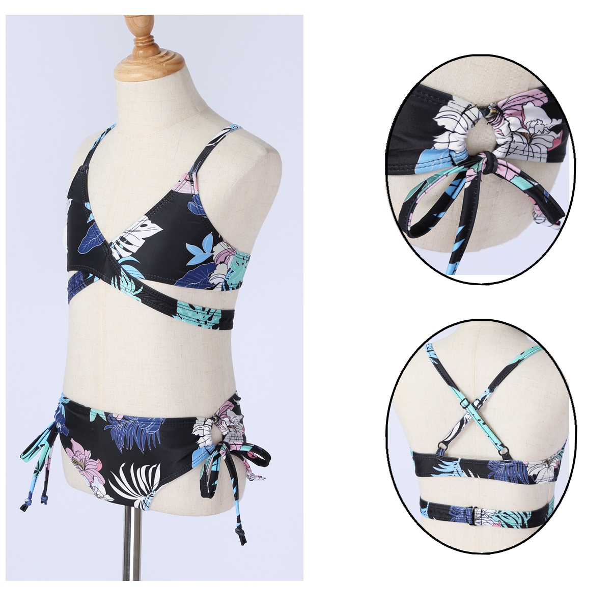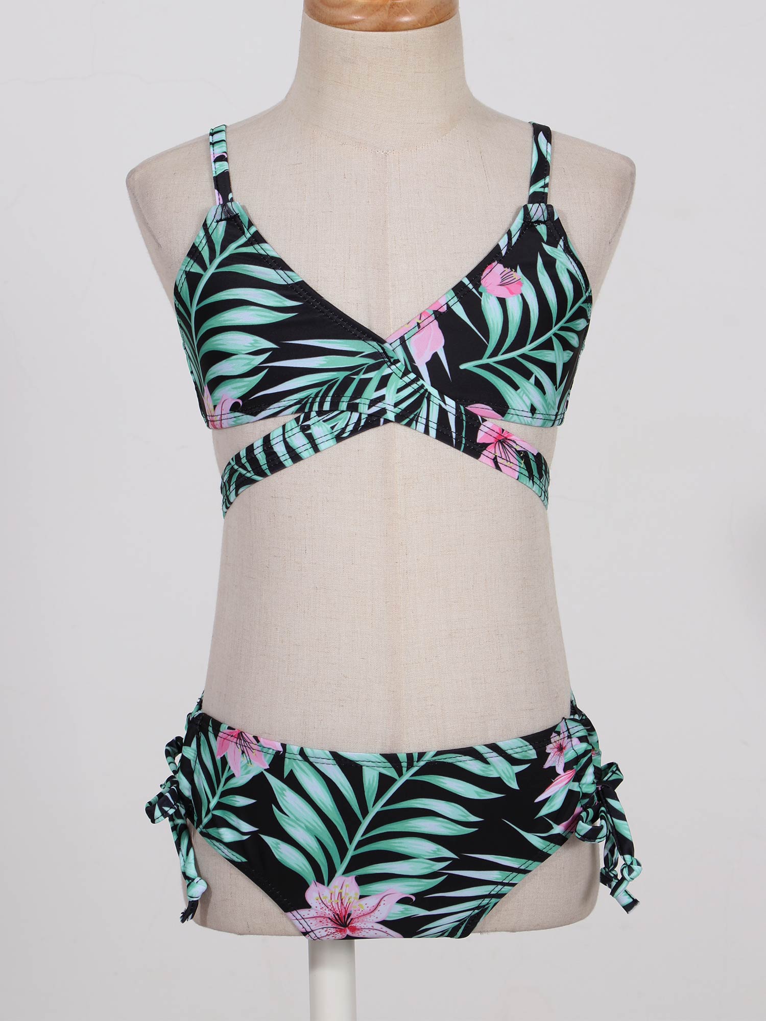 Бикини с цветочным принтом для девочек, с v-образным вырезом, регулируемые бретельки на бретельках, крест-накрест сзади, треугольный бюстгальтер на бретельках, застежка-зажим, низкая талия, короткий шнурок сбоку.