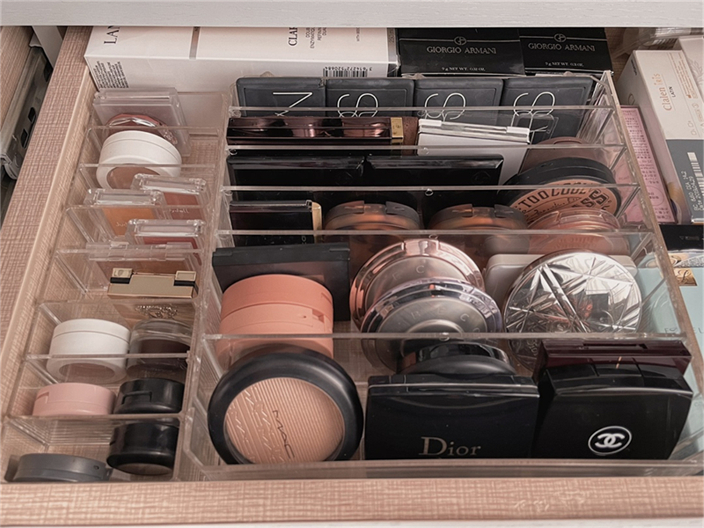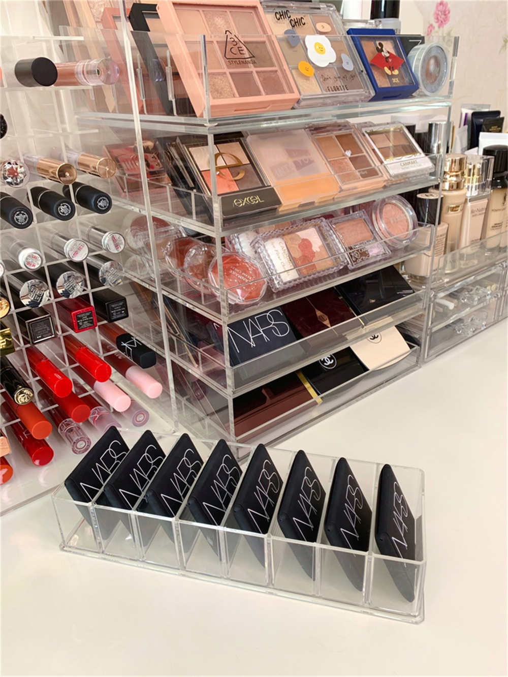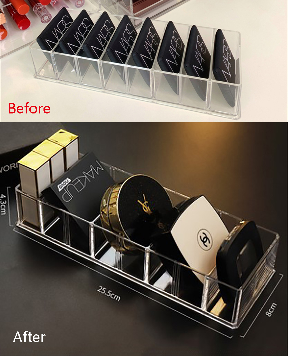 Характеристики продукта: прозрачный акриловый материал, регулируемая ширина отсеков, отлично подходит для рабочего стола и рисования, подходит для различных теней для век, румян для щек, прессованной пудры и т. д.