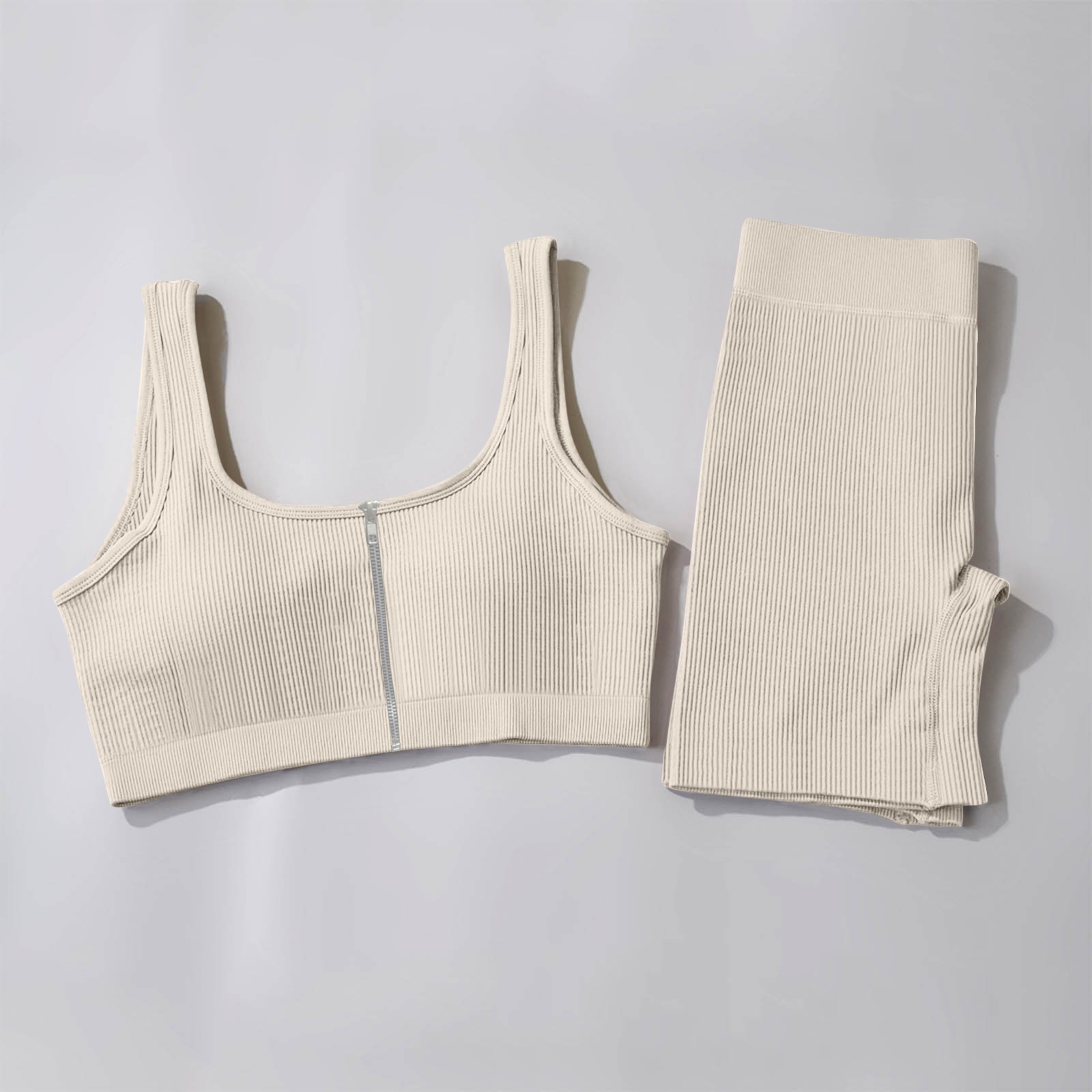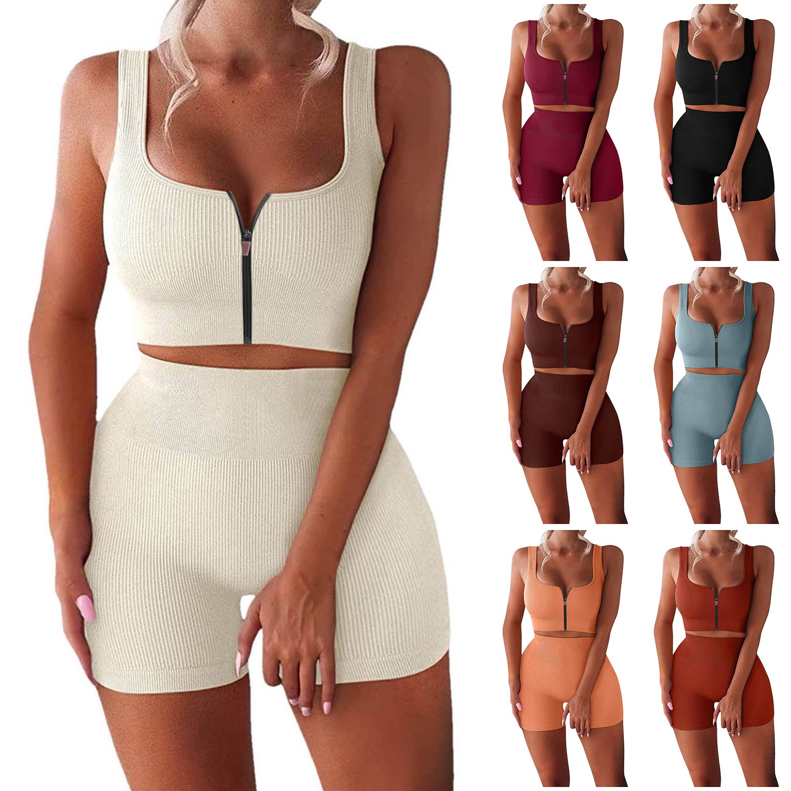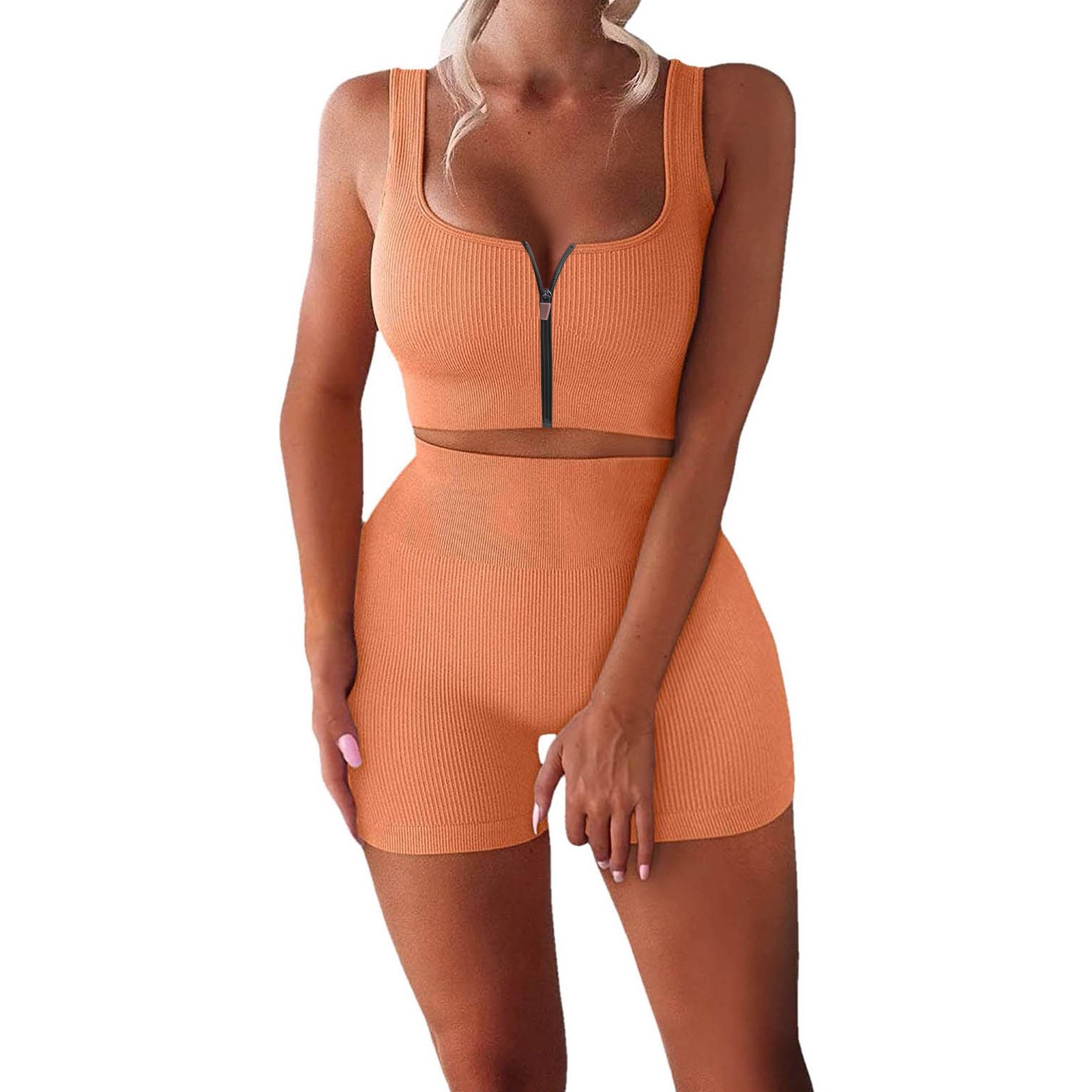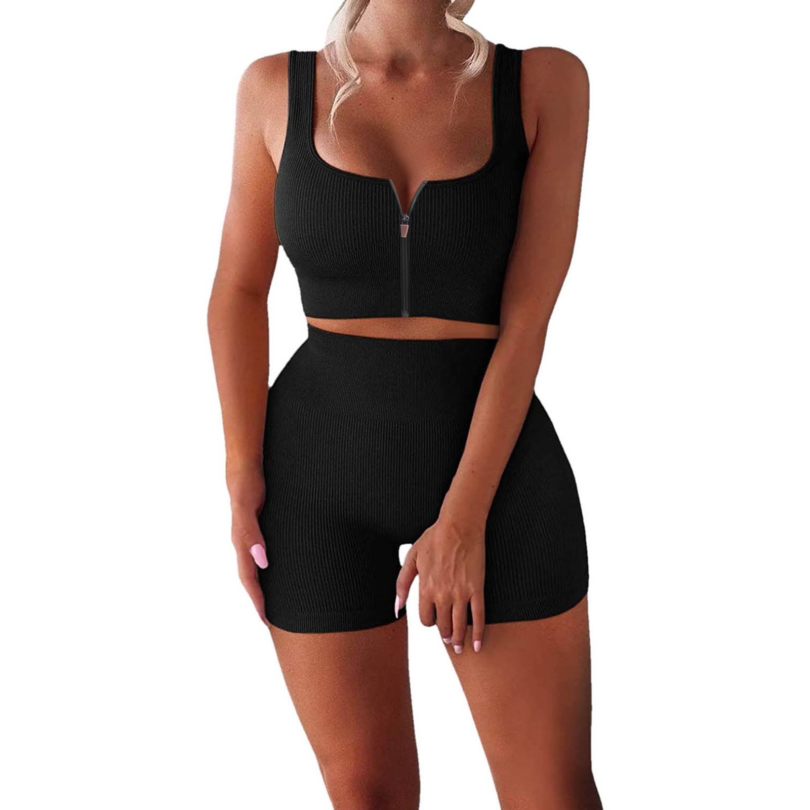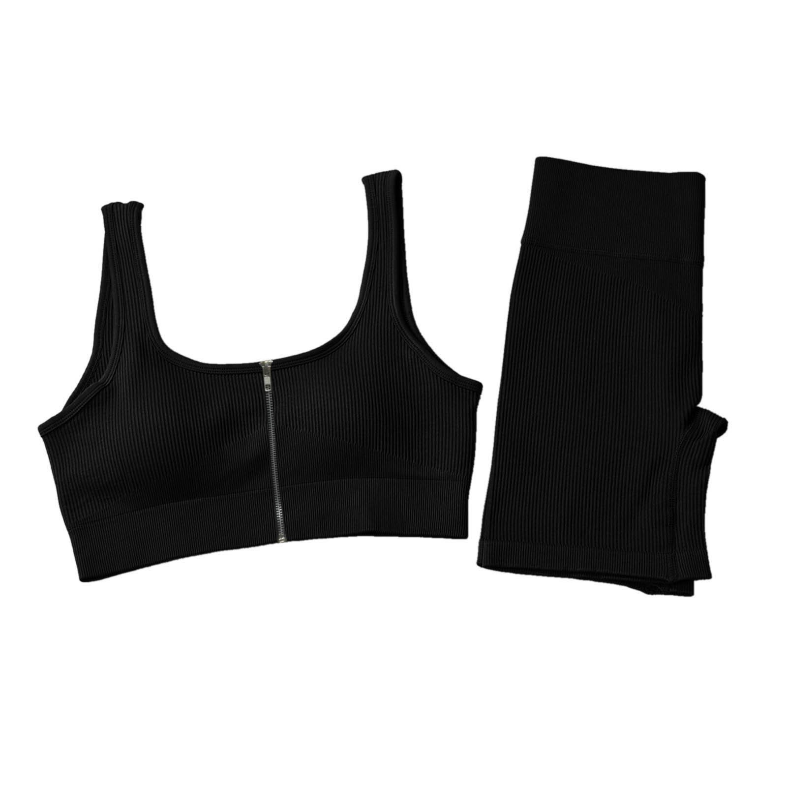 Женские комплекты для тренировок, 2 шт., на молнии, ребристый танк с высокой талией, шорты, одежды для йоги
