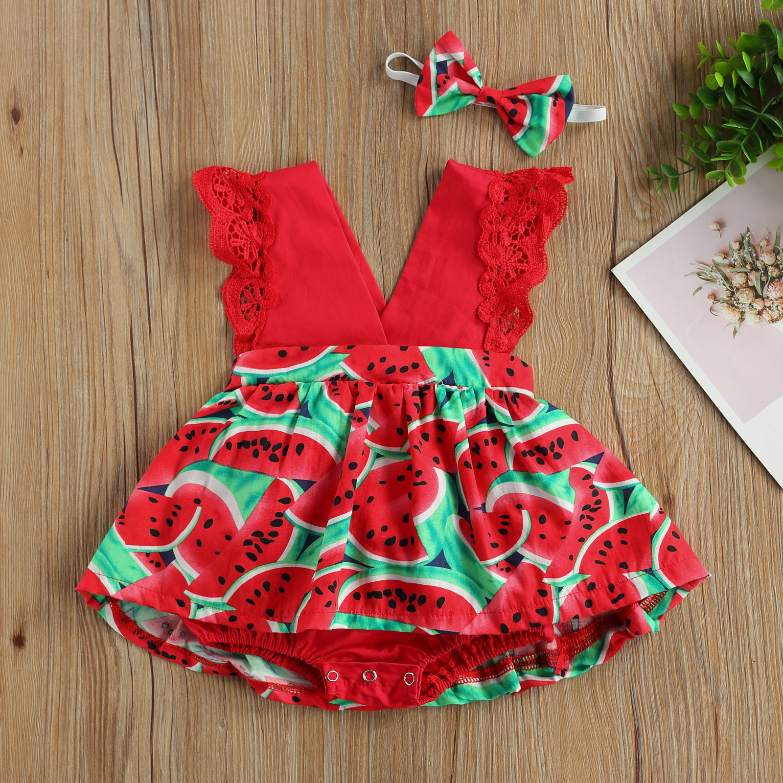 Детский комплект одежды с принтом арбуза, короткий комбинезон без рукавов с глубоким v-образным вырезом для девочек + повязка на голову с бантом