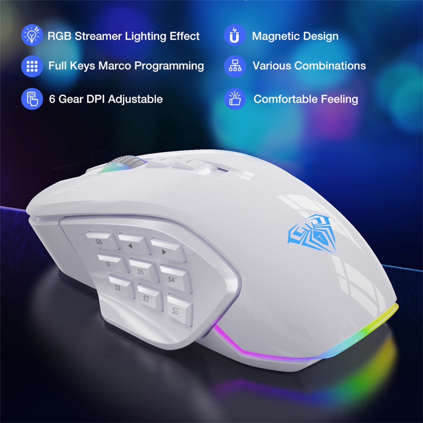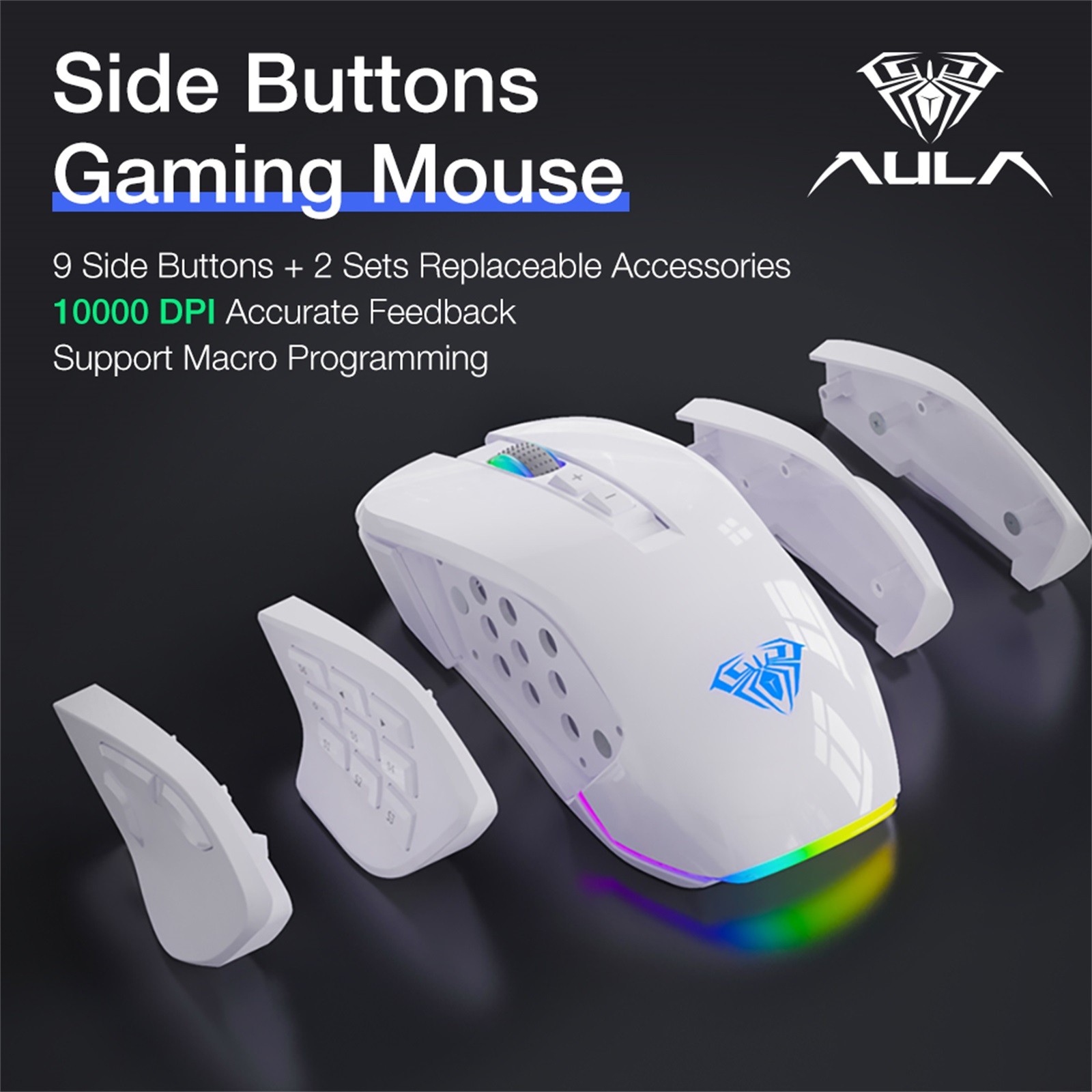[Расширенный контроль] AULA ММО мыши также является регулируемым дополнительным коврик для мыши, Предустановленная (2,4 Г) x 8 вес. 12 кнопок сбоку разделены под углом и могут быть перемещены, просто прикоснувшись к ним. На стороне игровой мыши H510 есть приятное место для отдыха, где большой палец может отдыхать, когда он неактивен. Нижняя часть мыши оснащена двумя прочными гладкими подушечками для ног, которые могут улучшить Скольжение Мыши и принести вам максимальный игровой опыт.