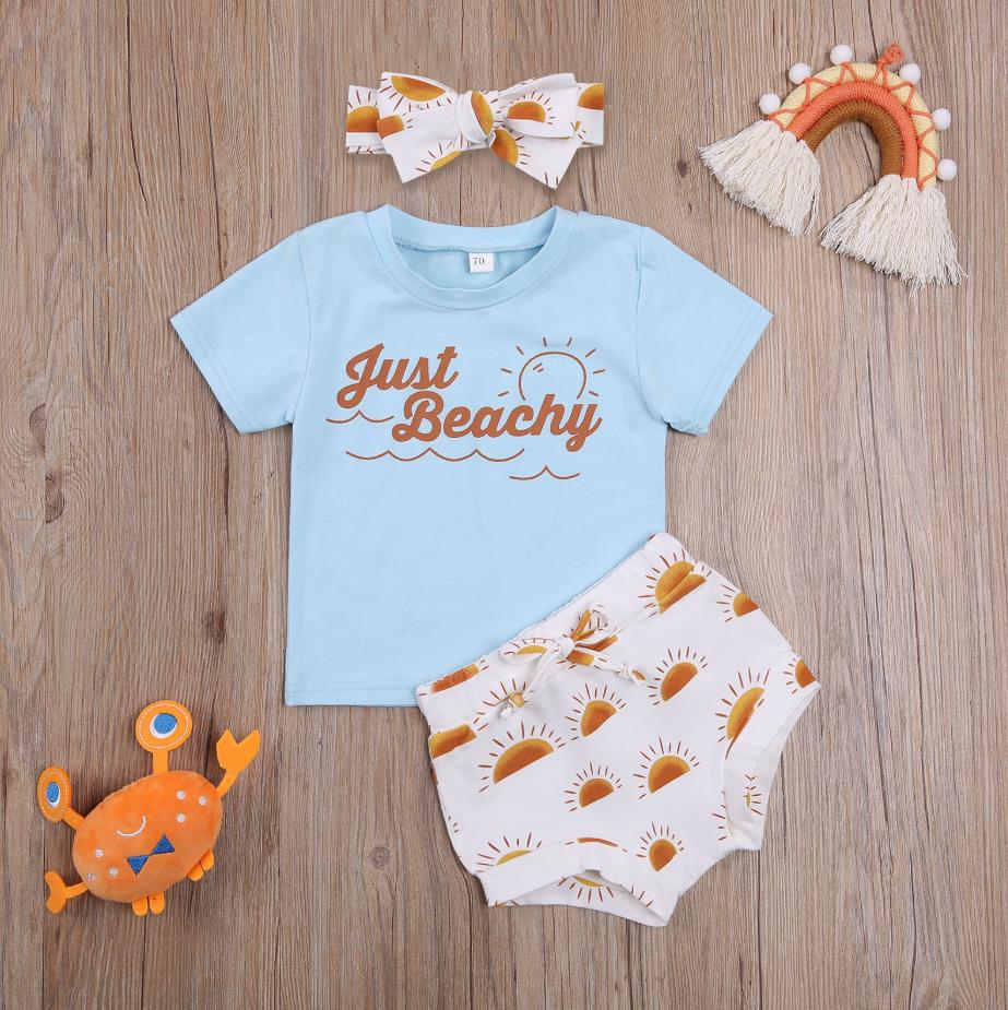 Летняя пляжная одежда для детей ясельного возраста из 3 предметов футболка с короткими рукавами с буквенным принтом + трусики с солнечным светом + повязка для волос для маленьких девочек