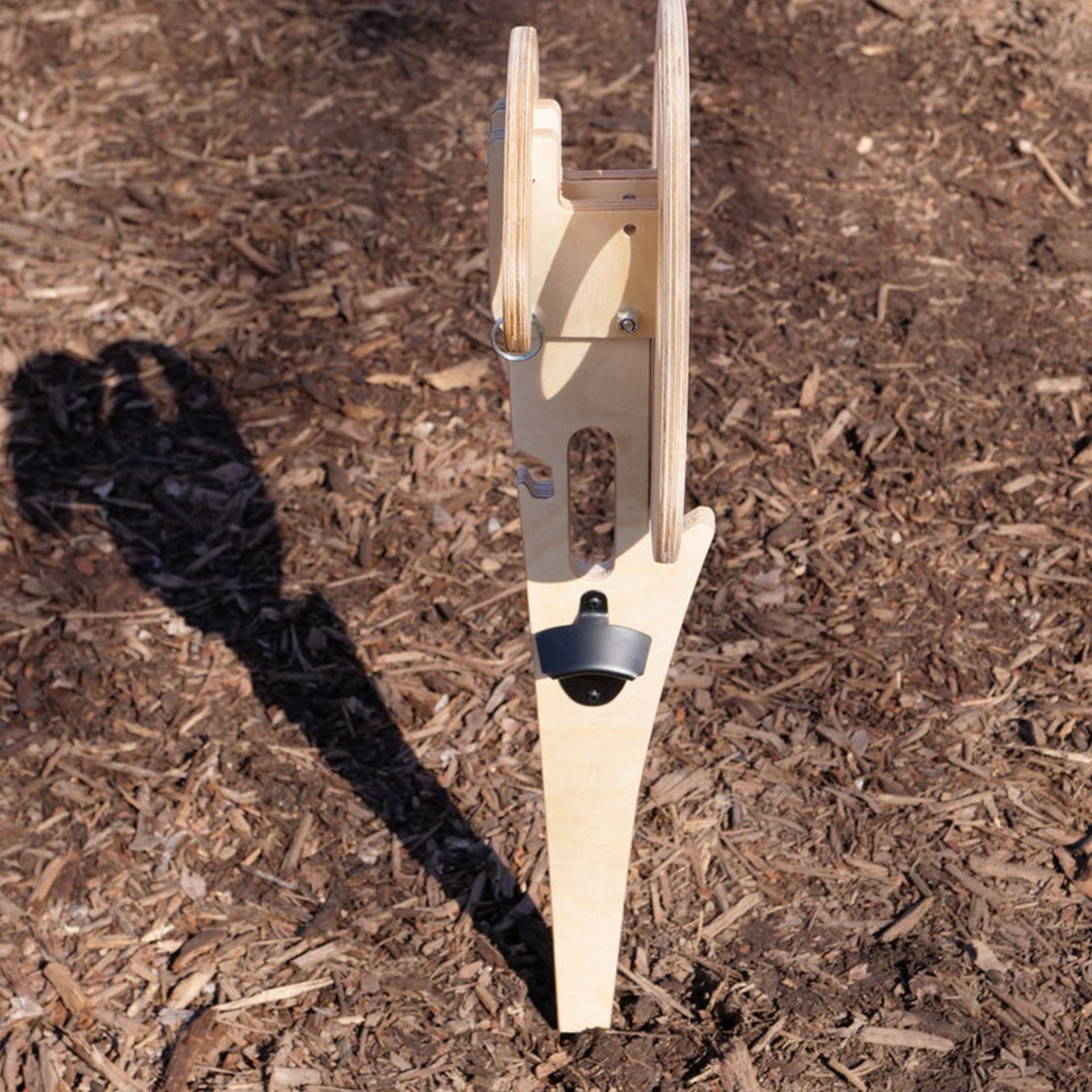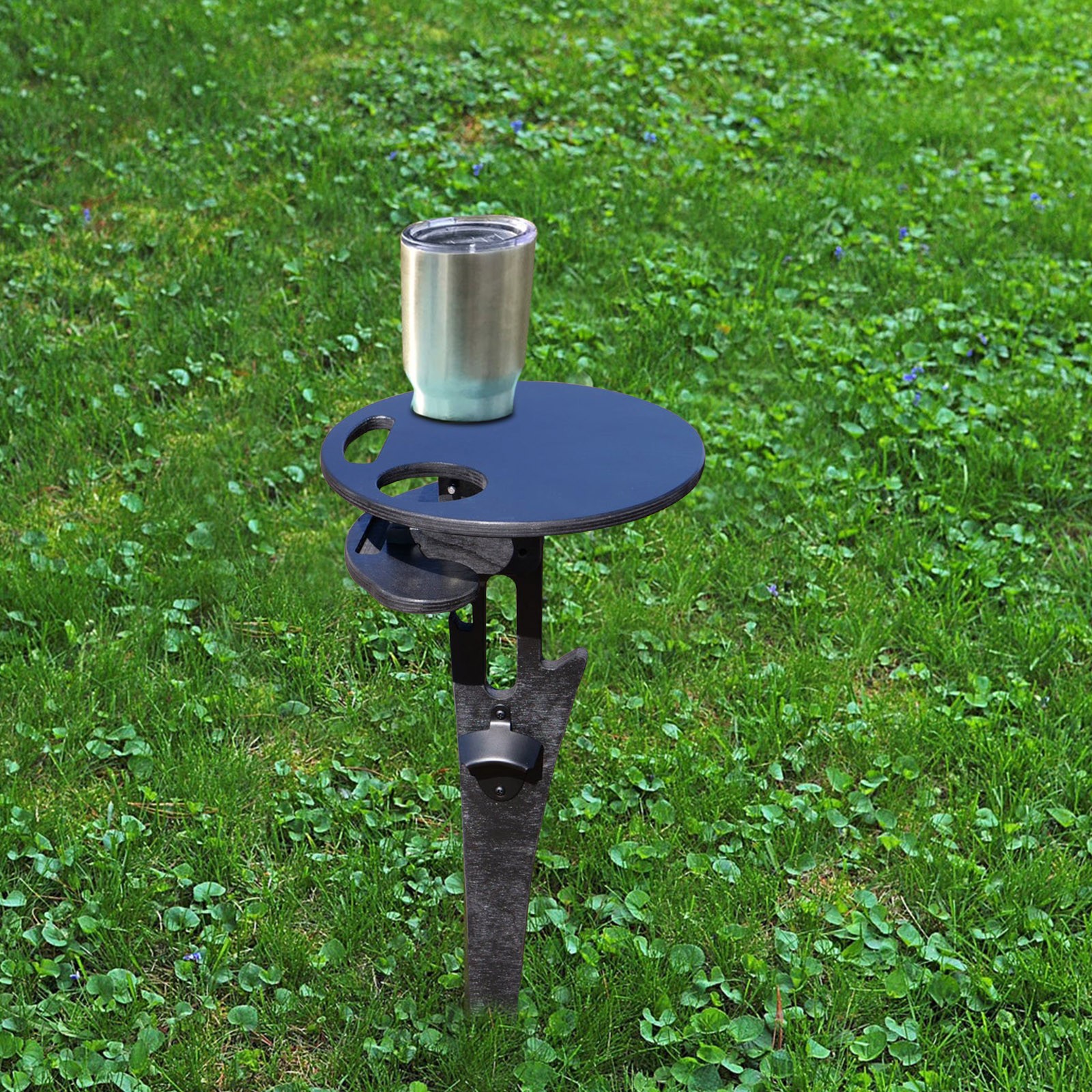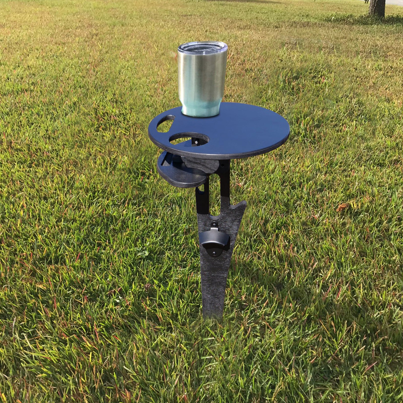 The fiberglass rod is durable and makes staking into the dirt, sand, or grass a breeze (you can even put it into a planter on your deck or balcony). The top has space for two beer bottles, pint glasses, cups, soda cans, bottle of water, etc., and plate of your favorite snacks
