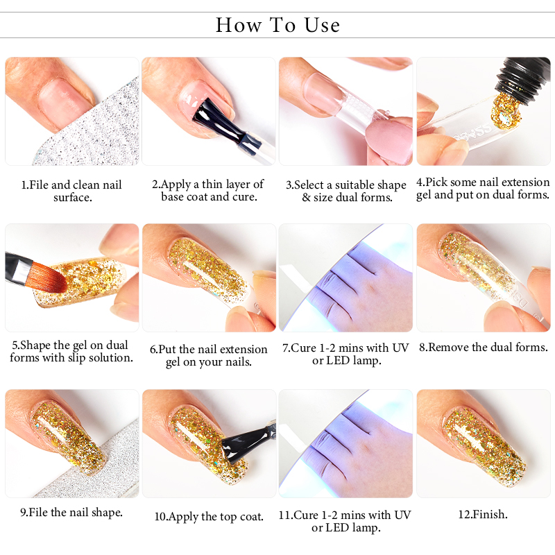 5. Требуется: необходимо использовать с основанием и верхним покрытием, Слип-растворами (опционально) и излечиваться под УФ/светодиодной лампой для ногтей.